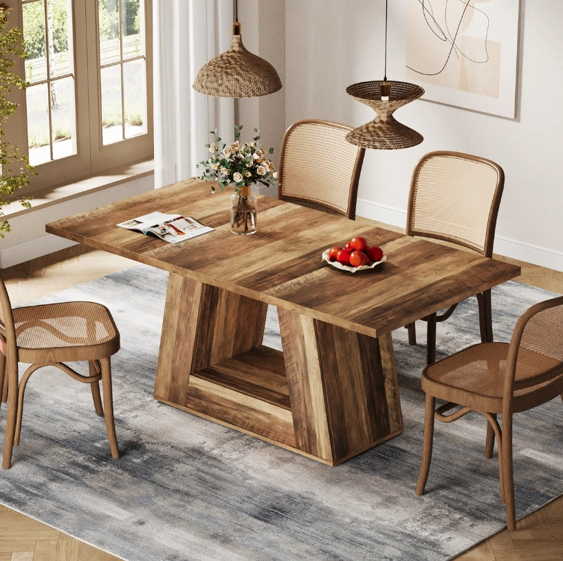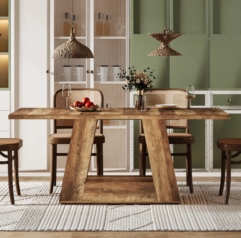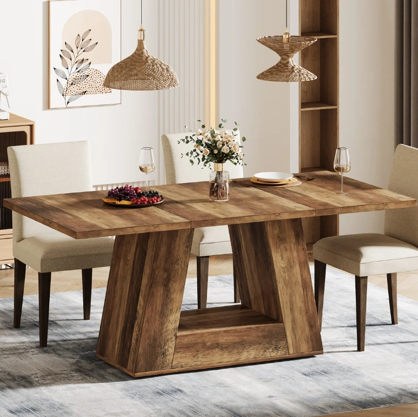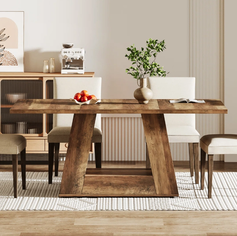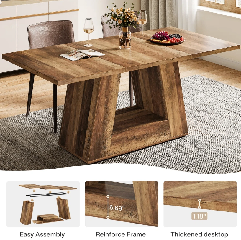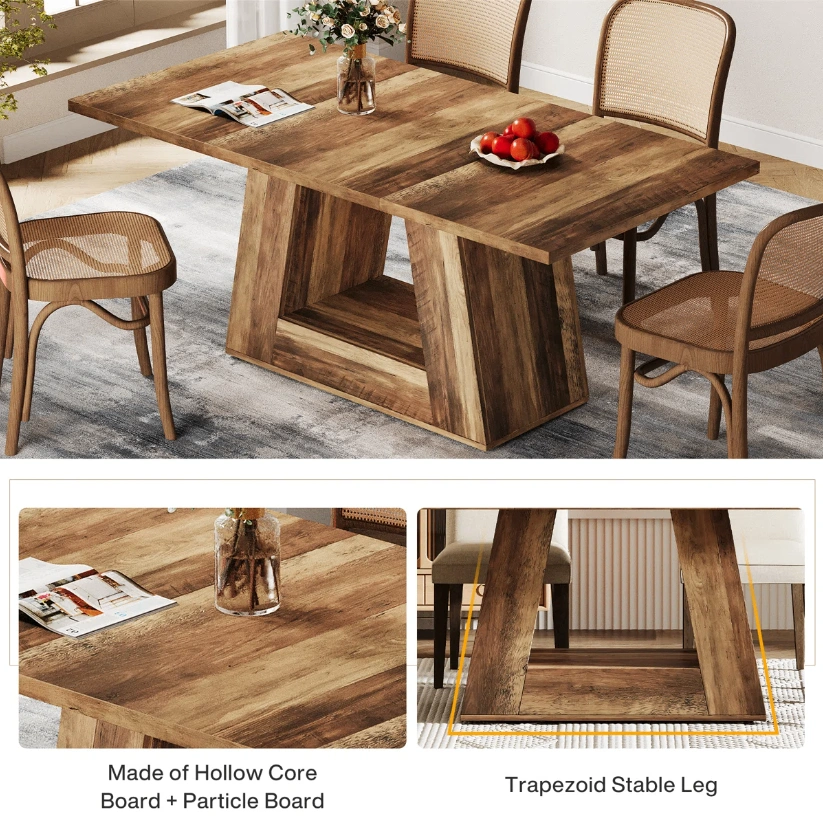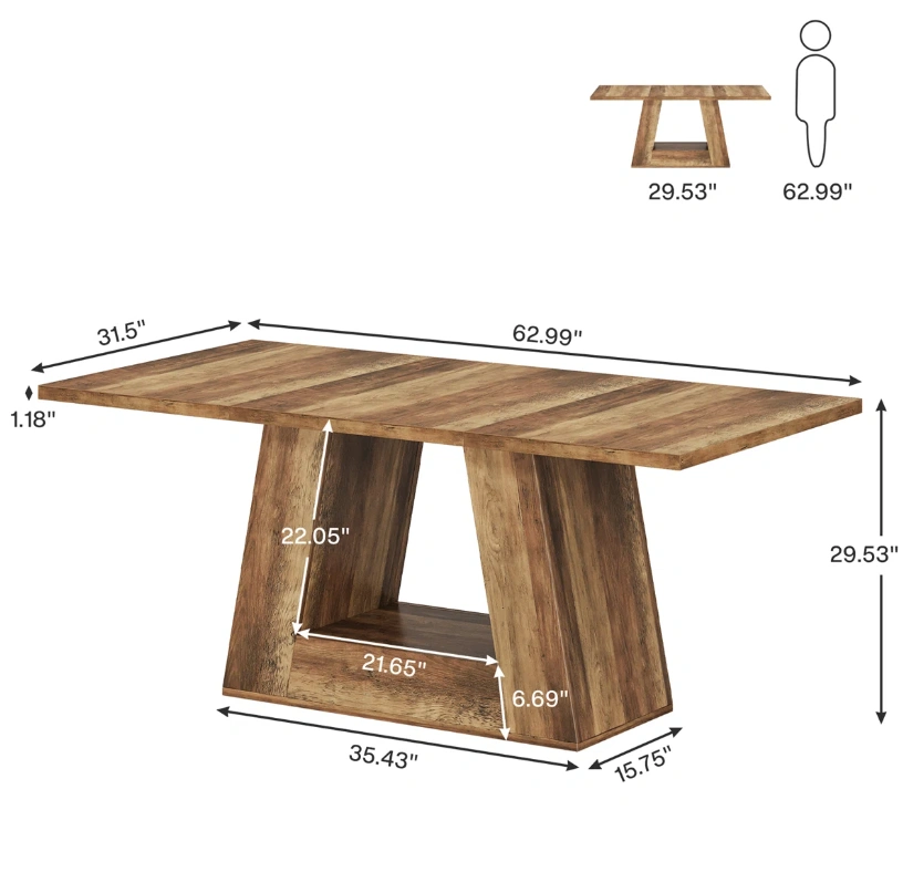 99About This Product This large wooden dining table, paired with unique trapezoidal table leg design. With the modern aesthetic style and beautiful appearance, this rectangle dining table is perfect for 4 to 6 people. Features Large Enough for 4 to 6 People: Measuring 63" W x 31.5" D x 29.5" H, it’s designed with ample space to comfortably seat up to six people. The spacious tabletop provides ample space for all your utensils, family gatherings and dinner parties Spacious Dining Table for 6: Measuring 62.99"W x 31.5"D x 29.5"H, this table comfortably seats 4-6 guests. Its generous surface accommodates tableware, family meals, and social events with refined practicality Sturdy and Long-Lasting Construction: Crafted with sturdy materials and expert engineering, the dining table provides a sturdy and stable foundation for all your dining needs. Under the dependable support, you can enjoy family meals or host a festive gathering with this table Durable Design: Engineered with reinforced materials and precision construction, this dining table ensures lasting stability for daily meals and celebrations. Its robust framework supports gatherings seamlessly, combining resilience with functionality Easy to Assemble: Coming with easy-to-follow installation instructions and hardware tools,the dining table is easy to install. The wooden dining table not only can be used in your dining room, but is also suitable as a conference table, executive table, etc Versatile & Multifunctional Dining Room Table: This kitchen table is not only perfect for dining occasions, but it's also practical enough to be used in the office as a conference table and computer desk, making it the perfect choice for home and office When you accidentally spill your coffee while working hard, don’t worry, this versatile wooden office desk is made of waterproof material Overall Dimensions : 29.53'' H X 63'' W X 31.5'' D