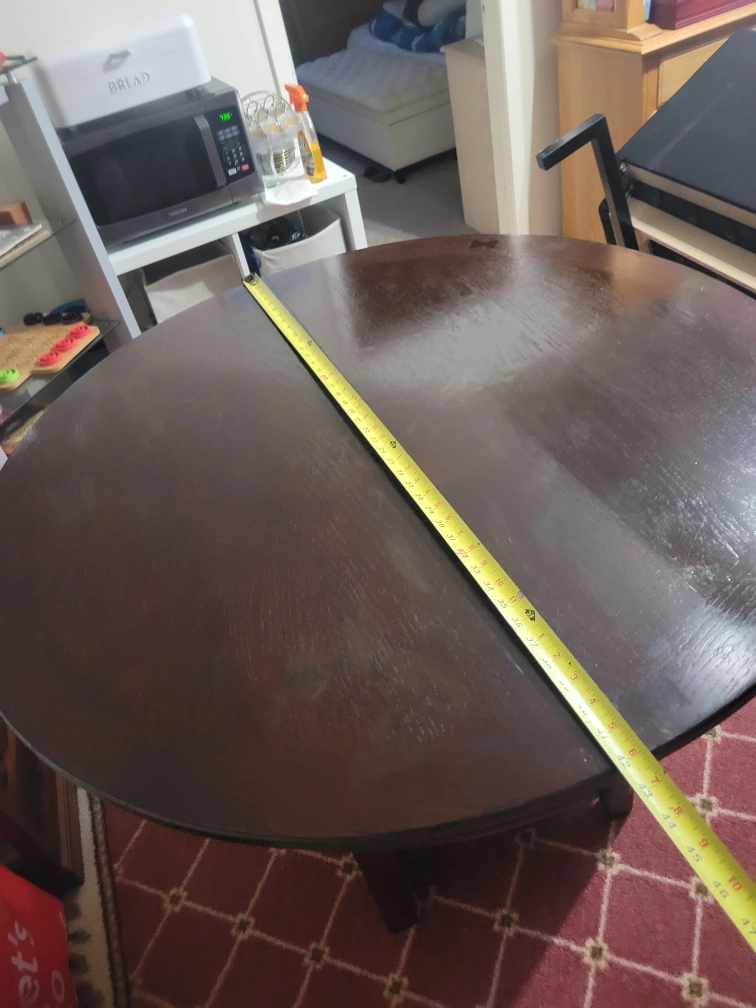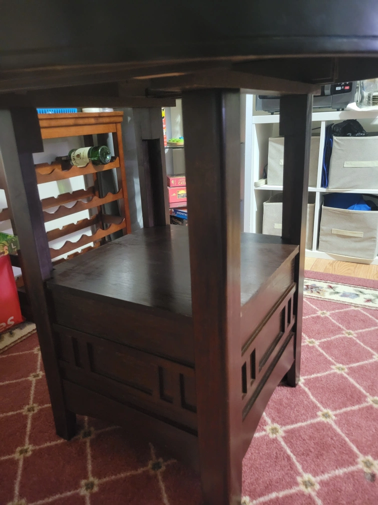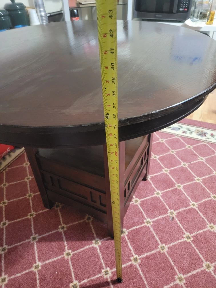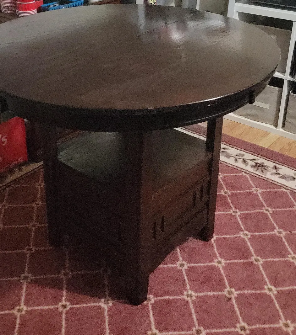 Selling a round, dark wood table. It has a diameter of approximately 42 inches. The table has a unique design with a shelf underneath the tabletop, providing extra storage or display space. It's a sturdy piece of furniture that would look great in a dining room or living area. Rescued this from my sister's boss. It's solid wood, and I cleaned, fixed, and tightened it to the best of my ability. It can come apart for storage in 4 pieces (tabletop comes apart in 2 pieces, the base and bottom shelf and more and you'll have to undo the bolts)