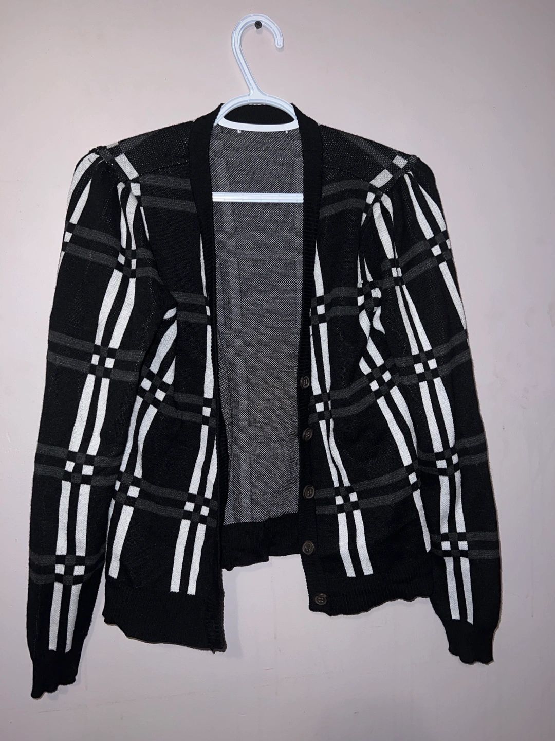 425Selling a black and white plaid cardigan. It's in great condition and would be a lovely addition to any wardrobe!
