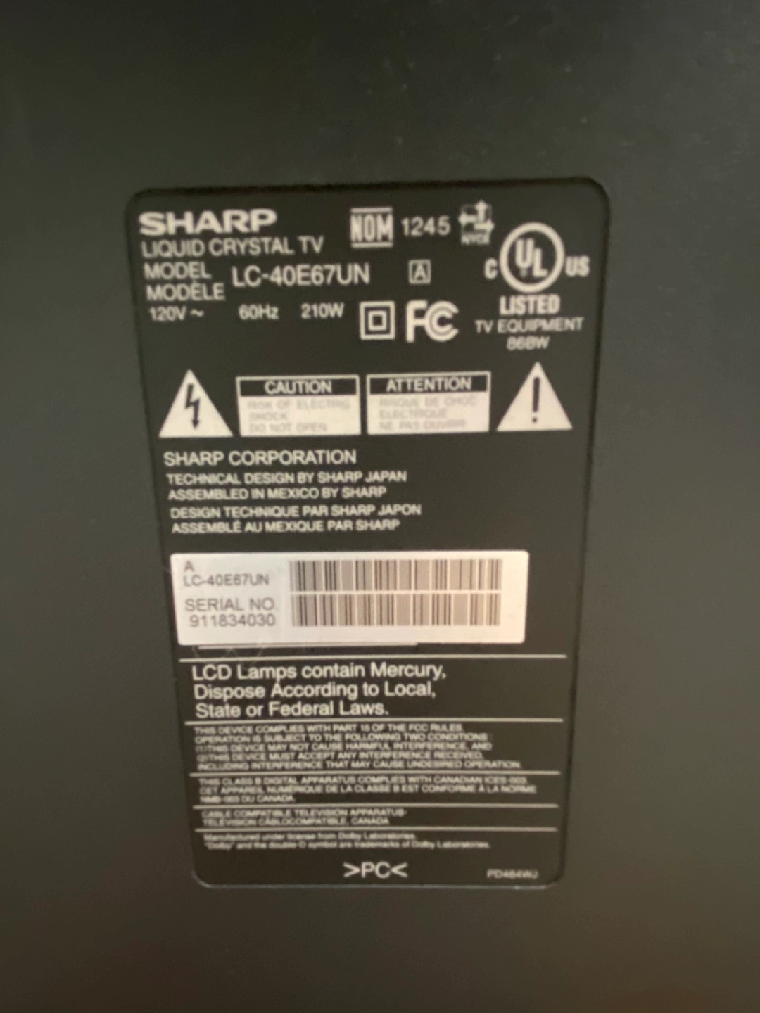 Selling a Sharp 40-inch LCD TV, model LC-40E67UN. It's in good working condition Perfect for a smaller space or as a secondary screen. A few signs of wear but works perfectly!