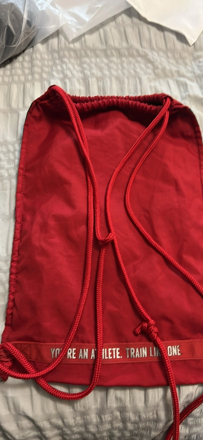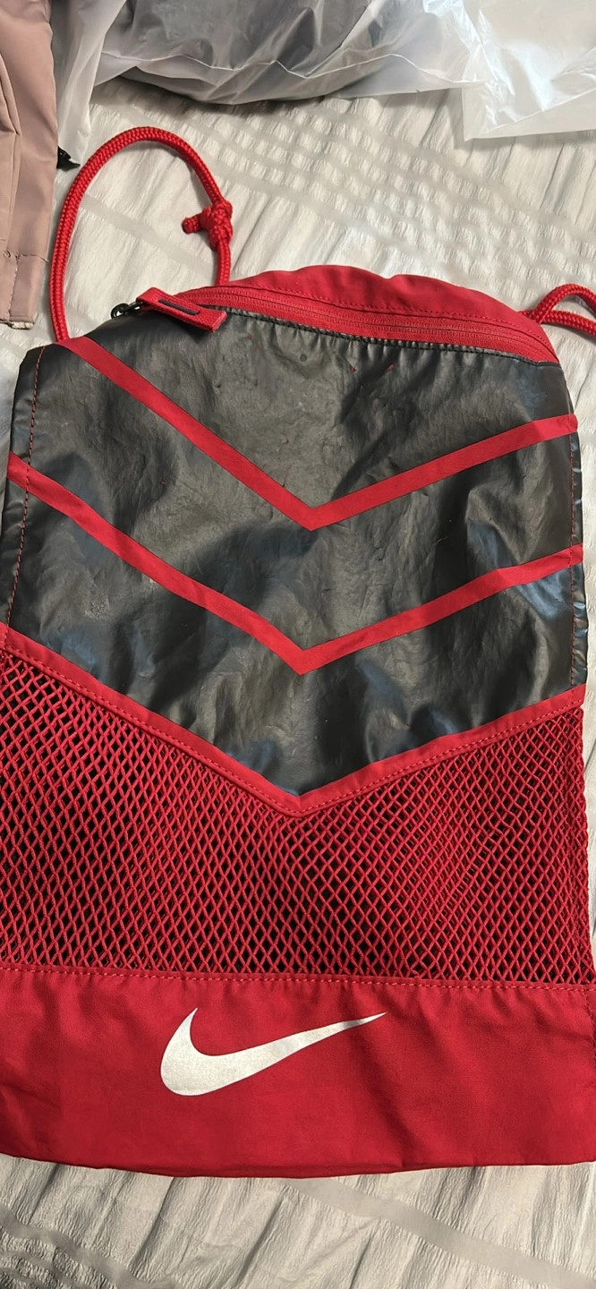 Selling a Nike drawstring gym sack in red and black! It's in great condition and perfect for carrying your gear to the gym or for everyday use. The bag features a mesh section and a bold Nike logo. It also has a motivational message on the bottom strap: "You're an athlete. Train like one"