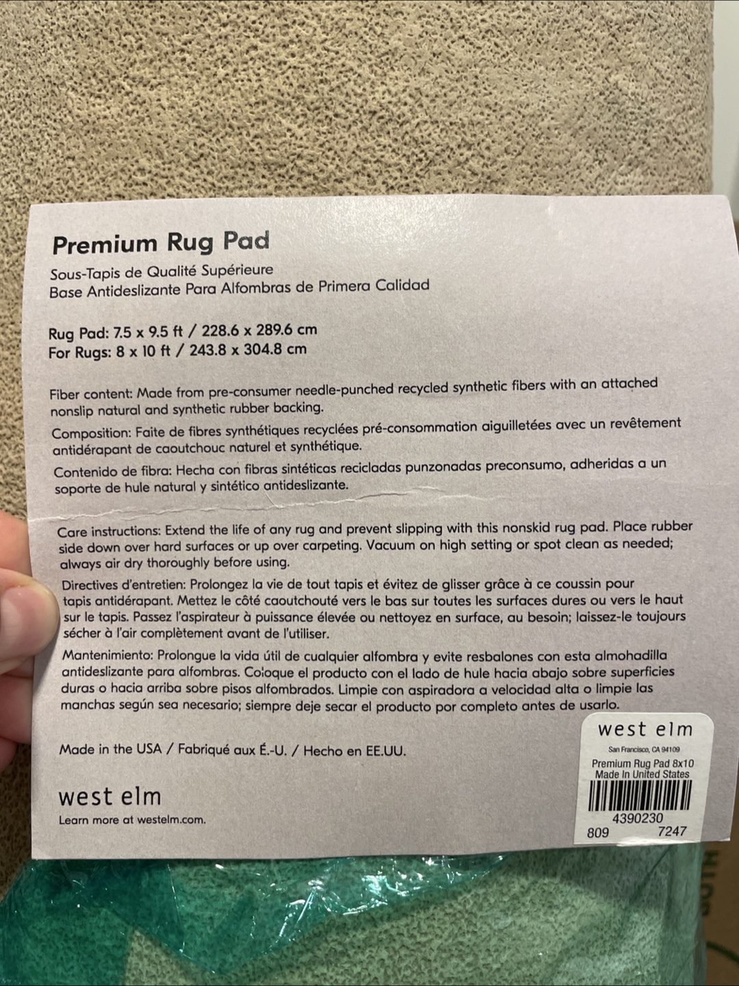 West Elm Premium Rug Pad 7.5 x 9.5 ft (for 8x10 rug)