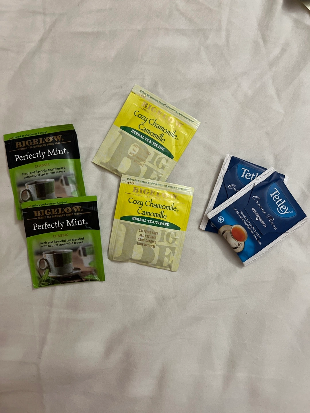 Giving away aa mix of tea bags including Bigelow Perfectly Mint, Bigelow Cozy Chamomile, and Tetley Orange Pekoe. Perfect for a cozy cuppa!