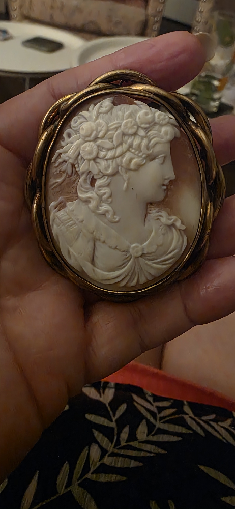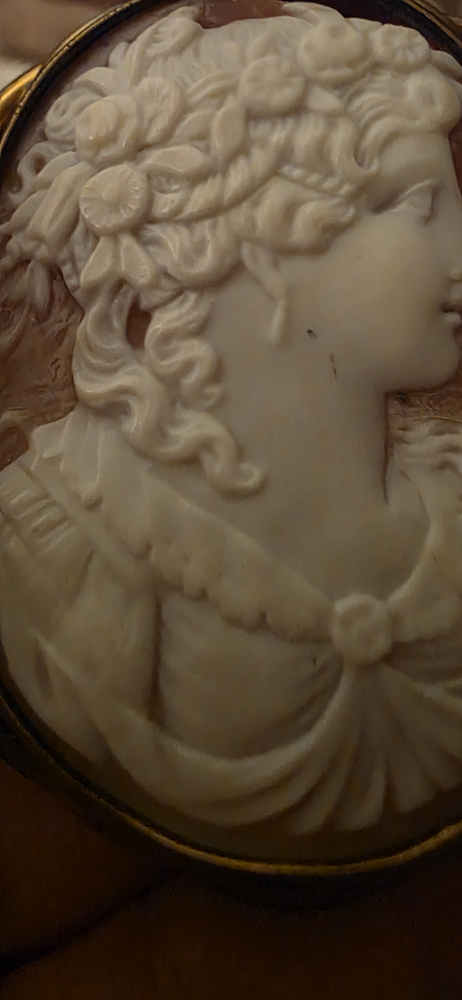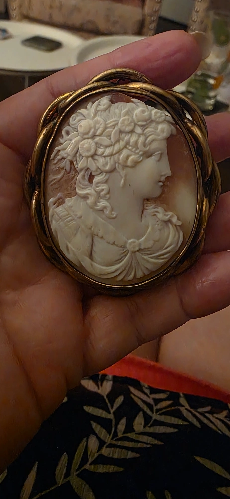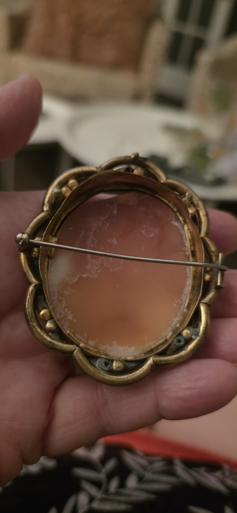 This is a vintage cameo brooch. It features a detailed carving of a woman's profile in a classic style. The frame is gold-toned and has an intricate design. It's in good condition for its age, with some minor wear on the back and coral is slightly chipped. The image displays a shell cameo brooch or pendant, featuring a profile of a woman with flowers and leaves in her hair and on her shoulder. This particular cameo is carved on a curve and set in a 10kt yellow gold frame, which includes a flip bale and double trim. It can be worn as either a brooch or a pendant, thanks to its safety catch and swing-up loop.