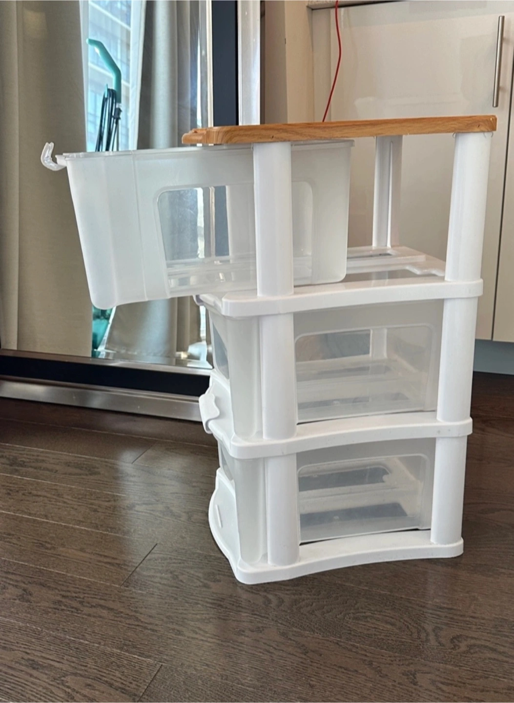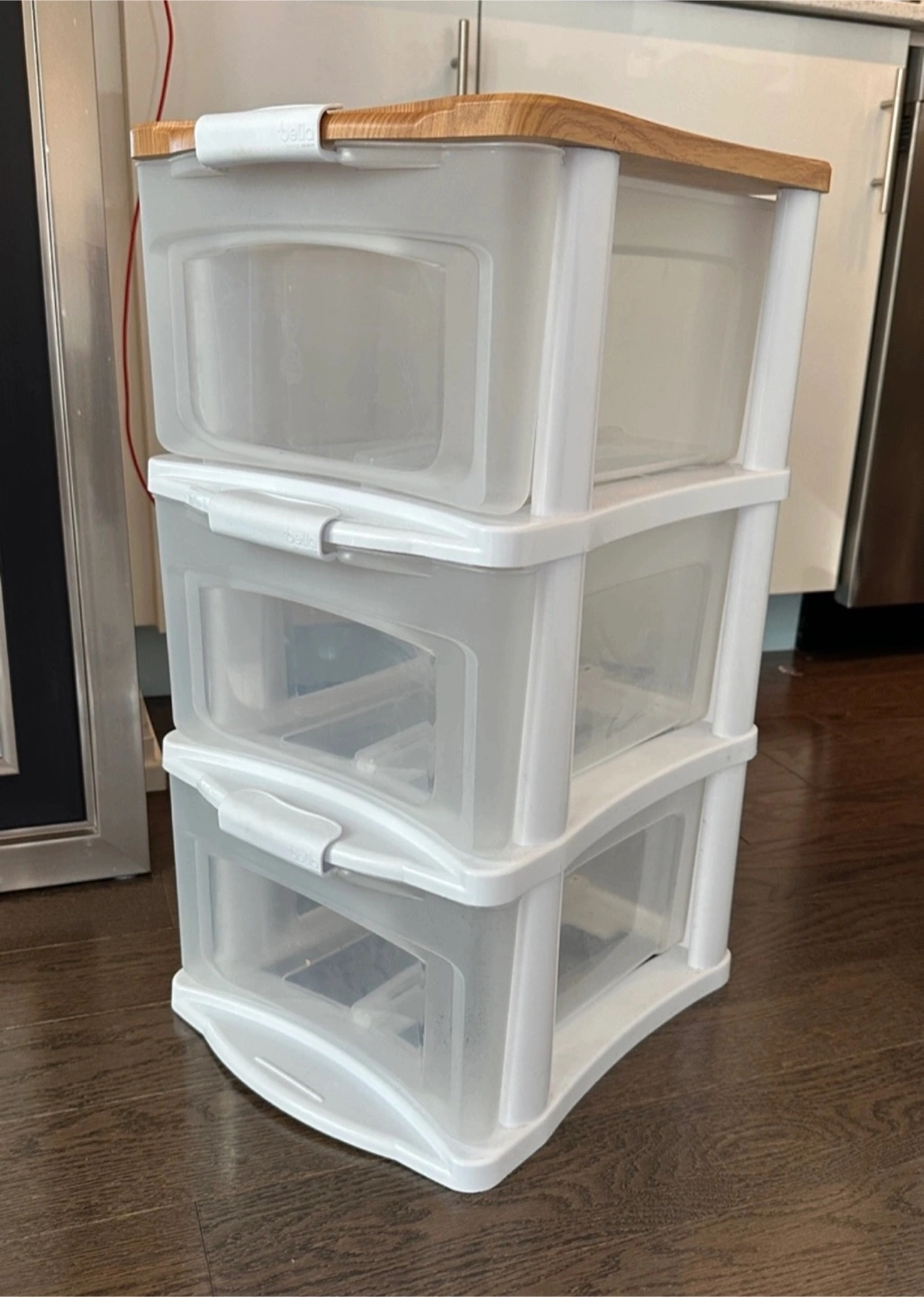 Here's a handy 3-drawer storage unit, perfect for keeping things organized. It's in great shape and ready to use. The drawers are clear so you can easily see what's inside, and the top has a nice wood-look finish. Great for any room in the house
