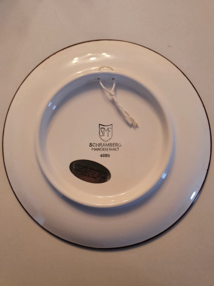 Selling a Schramberg Handbemalt decorative plate. It features a unique design and would be a lovely addition to any home! The plate has a floral pattern and German text. Numbered limited edition.