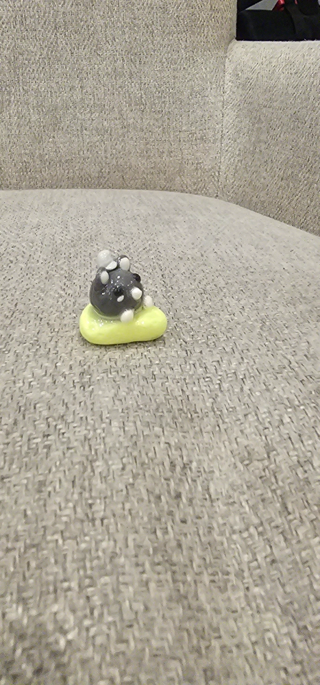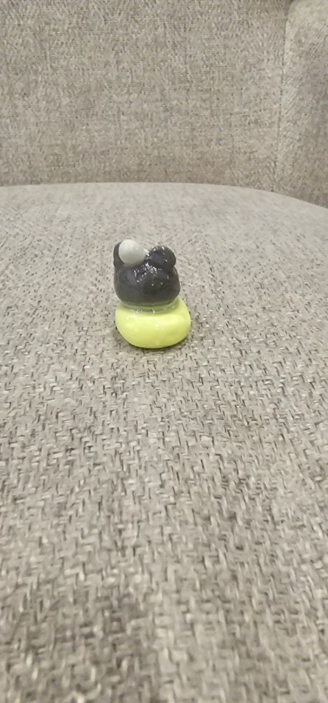 I'm selling a cute, handmade clay figurine! It looks like a little mouse wearing a hat, sitting on a lime yellow base. It's a unique piece that would look great on a shelf or desk. It is in great condition and ready for a new home!