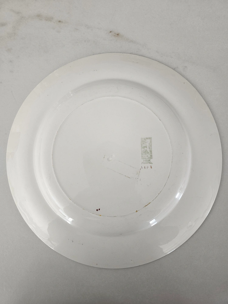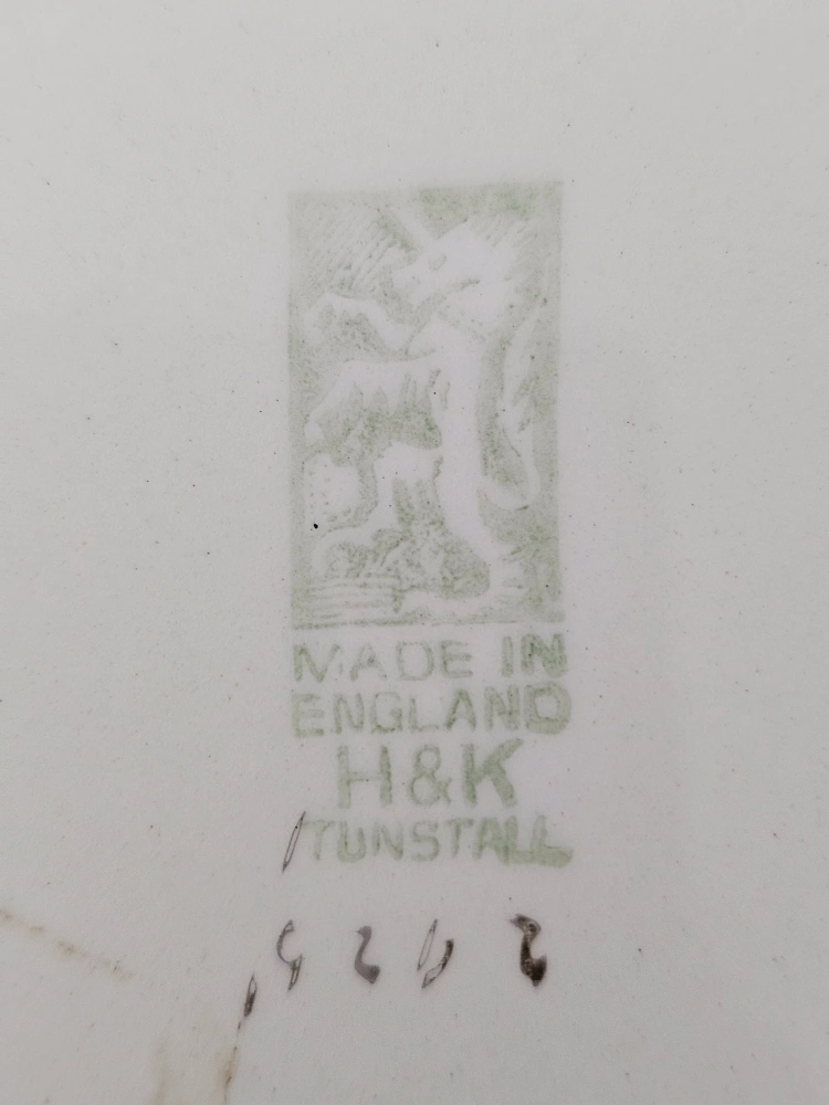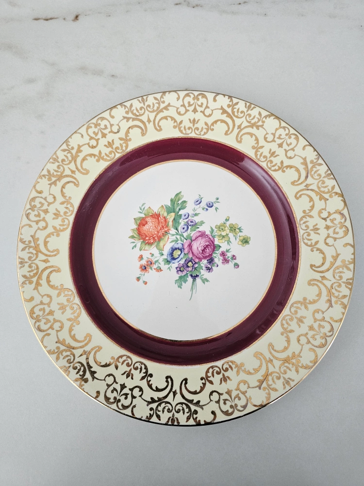 Selling a lovely H&K Tunstall plate. It features a beautiful floral design with gold accents and a burgundy ring around the center. The plate is marked "Made in England H&K Tunstall" on the back. Vintage Gold Rimmed 11" Floral Decorative Plate H & K Numbered. Made in England.