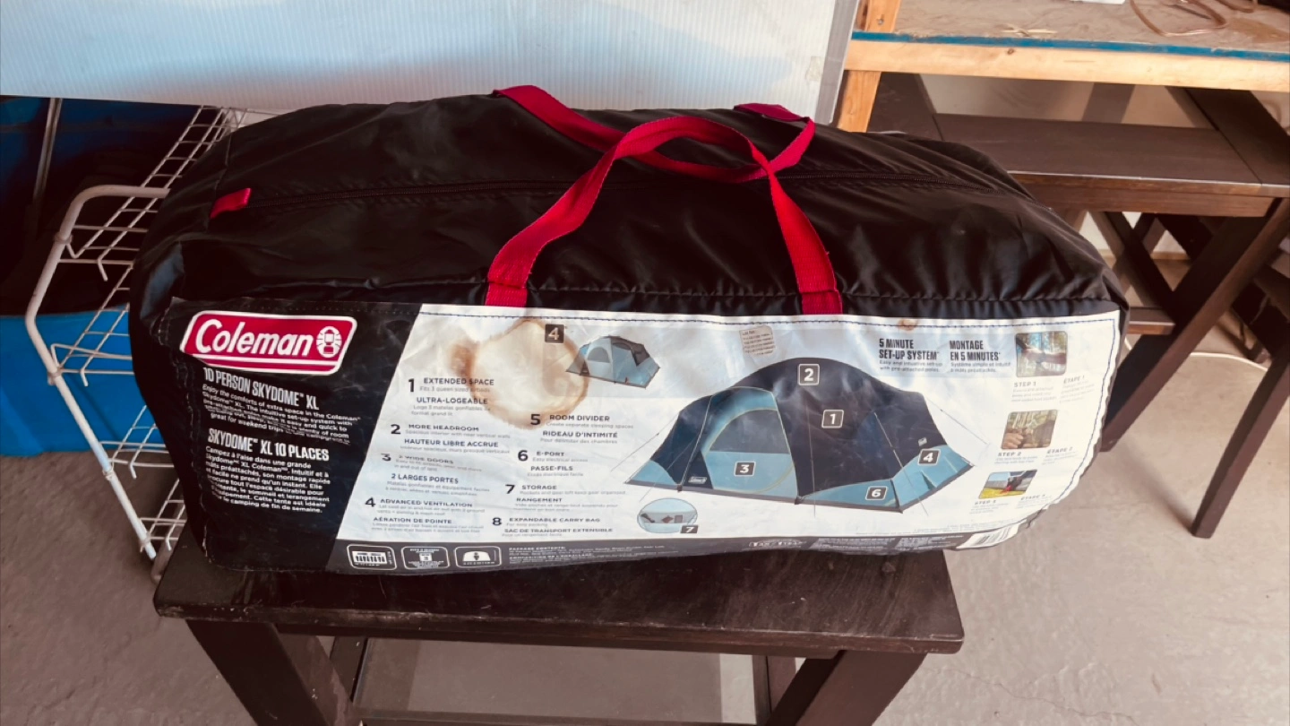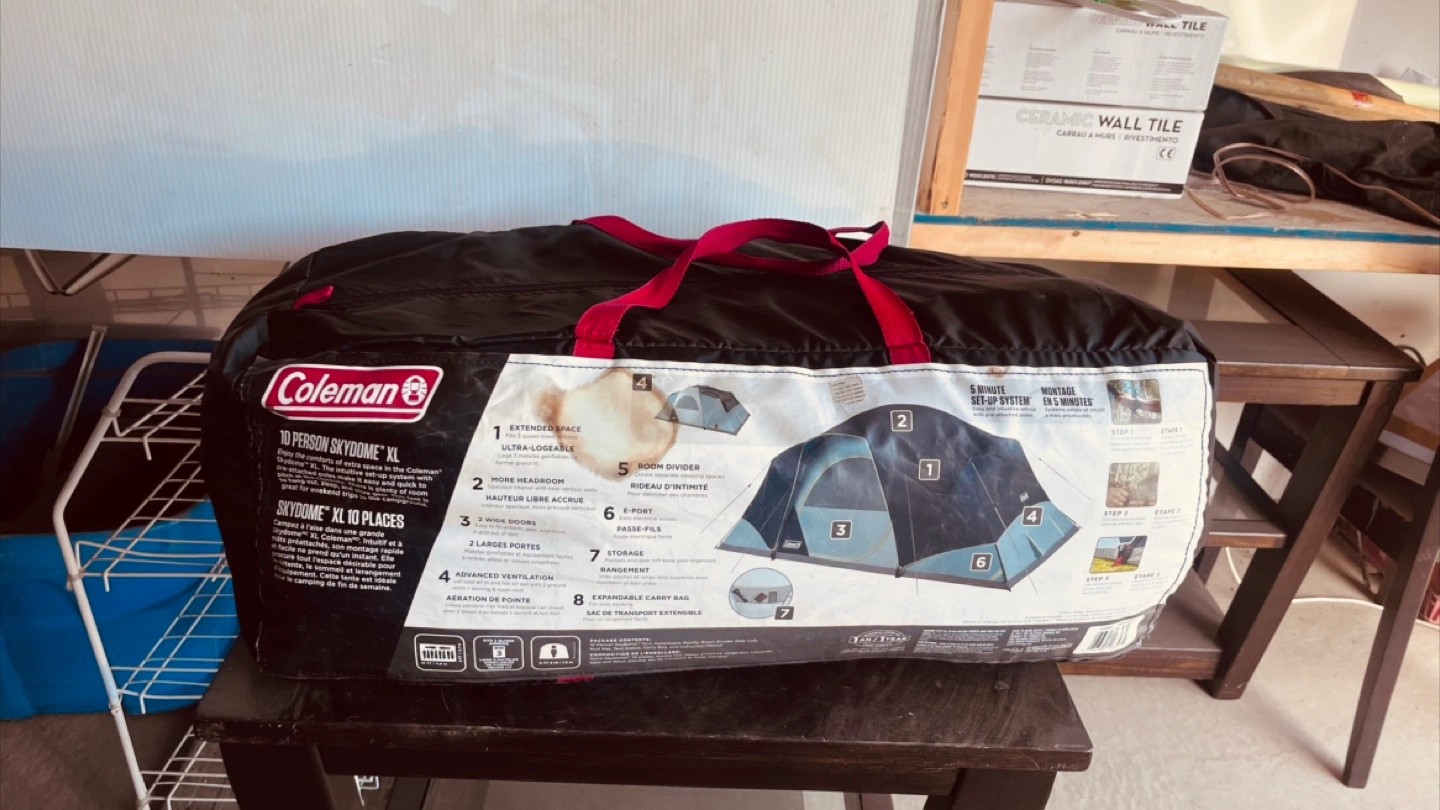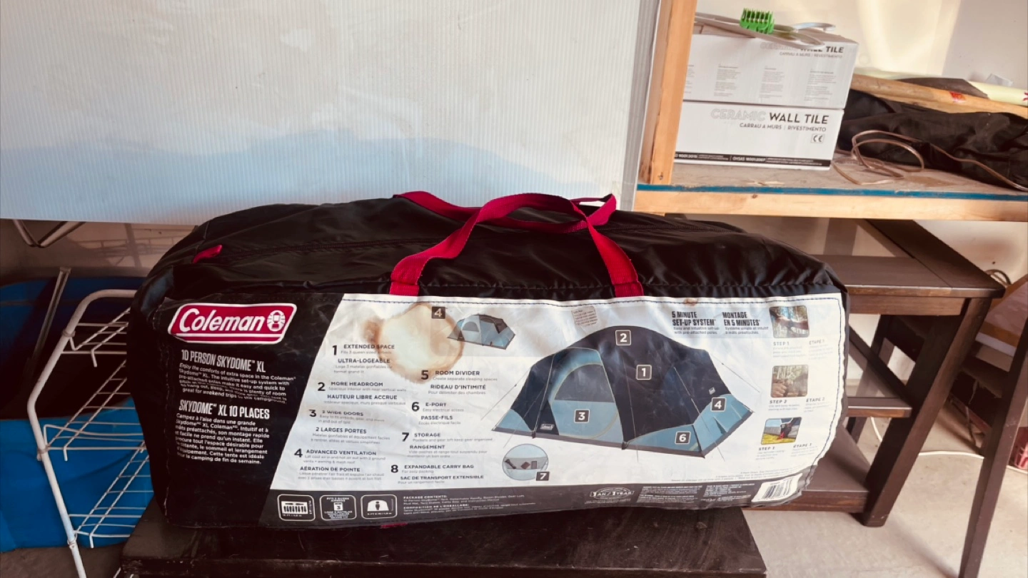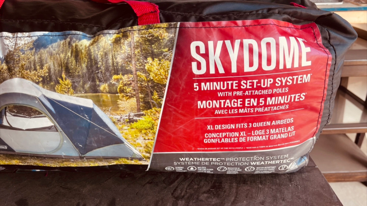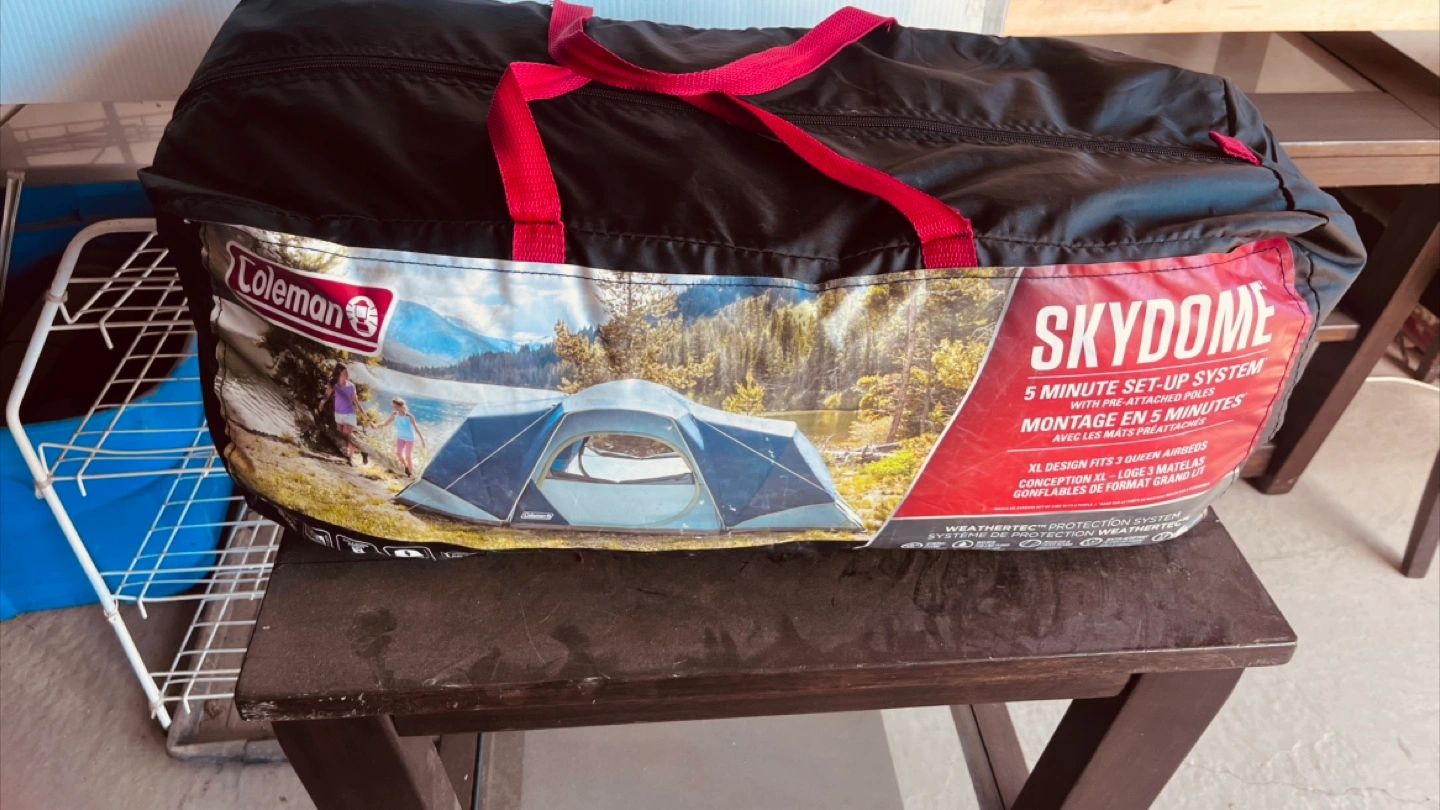 76Selling a Coleman Skydome XL 10-person tent! It has a 5-minute set-up system with pre-attached poles. The XL design fits 3 queen airbeds. This tent also features the Weathertec protection system.