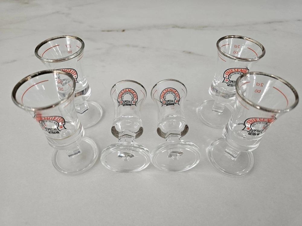 Here's a set of six Friesengeist shot glasses, perfect for adding a touch of German flair to your barware collection! Each glass features the classic Friesengeist logo. They're in great shape and ready for your next gathering