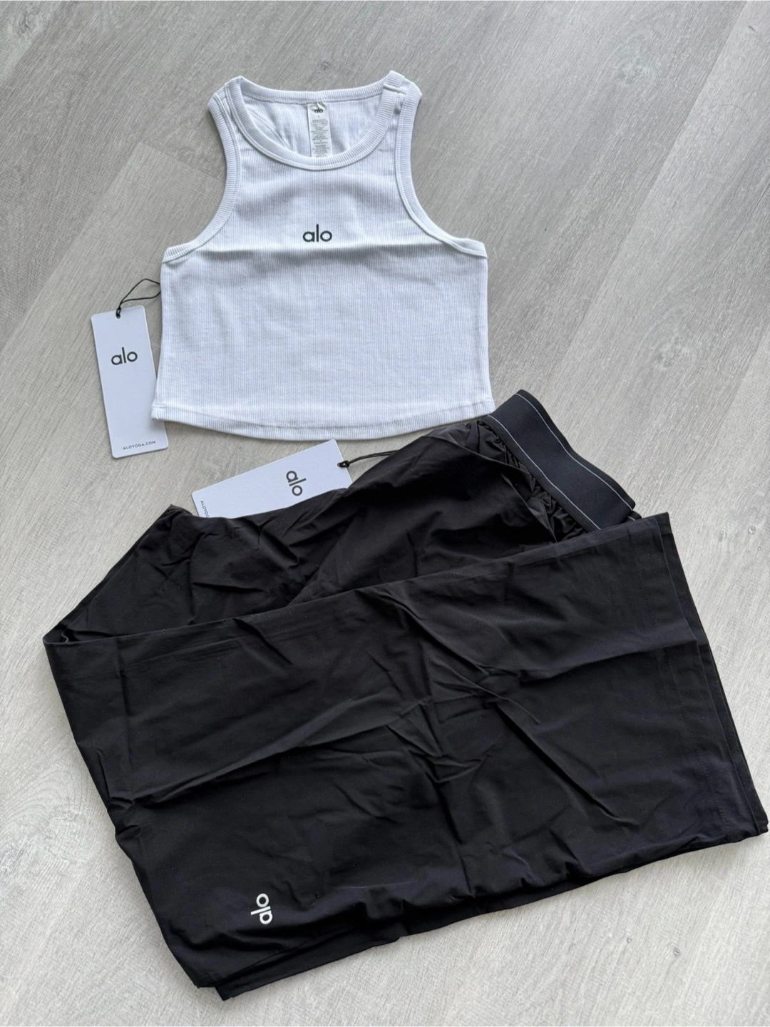 Selling a set of ALO Yoga items brand new and authentic with tags. Includes a ribbed cropped tank and a pair of 'Suit Up' trousers “30. Perfect for yoga or everyday wear! Message me your sizing!