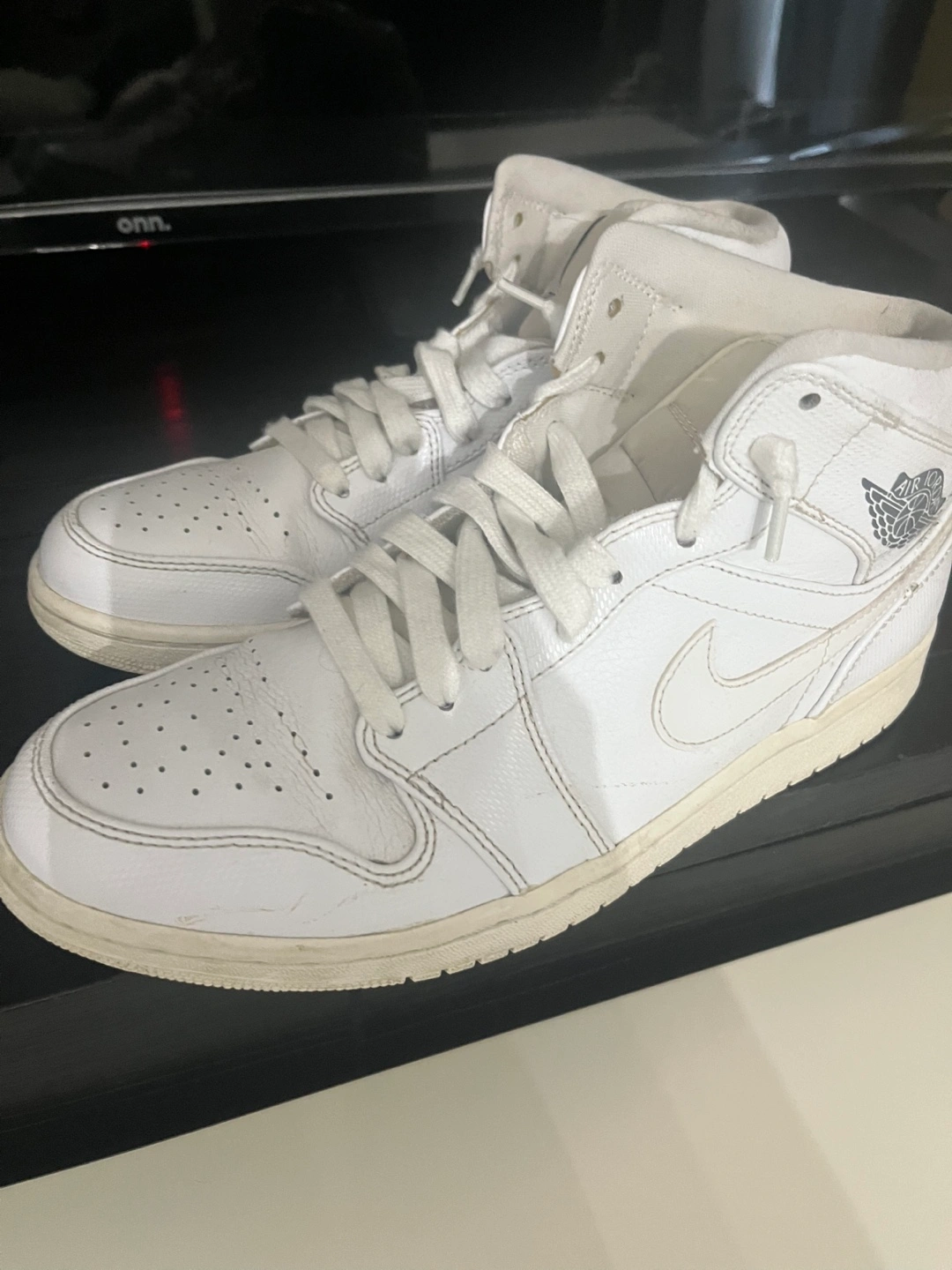 Selling a pair of Air Jordan 1 high-top sneakers. They're white and in good condition. Size 9.5 Pick up only. Closest intersection is Jane St and Eglinton Ave