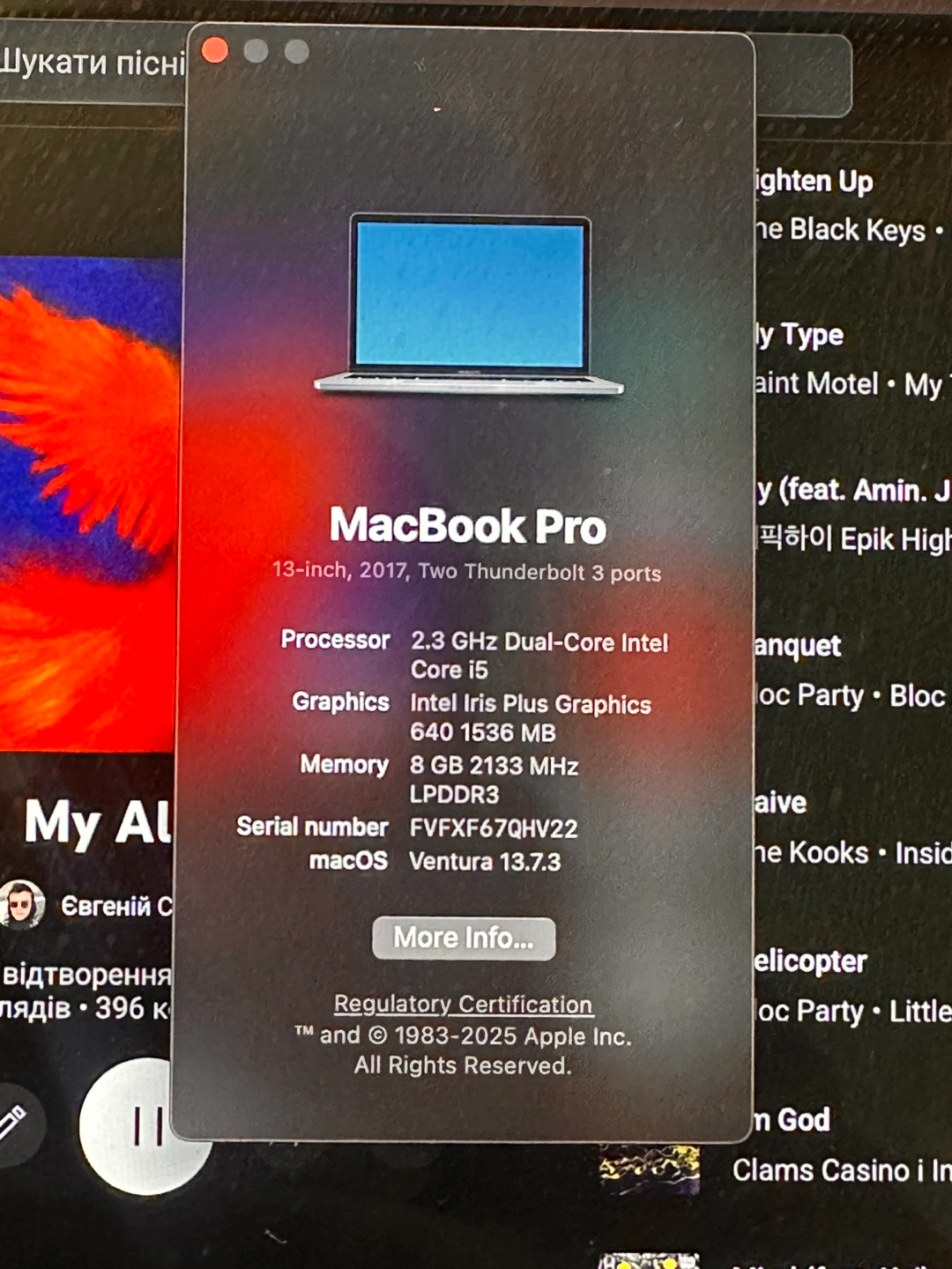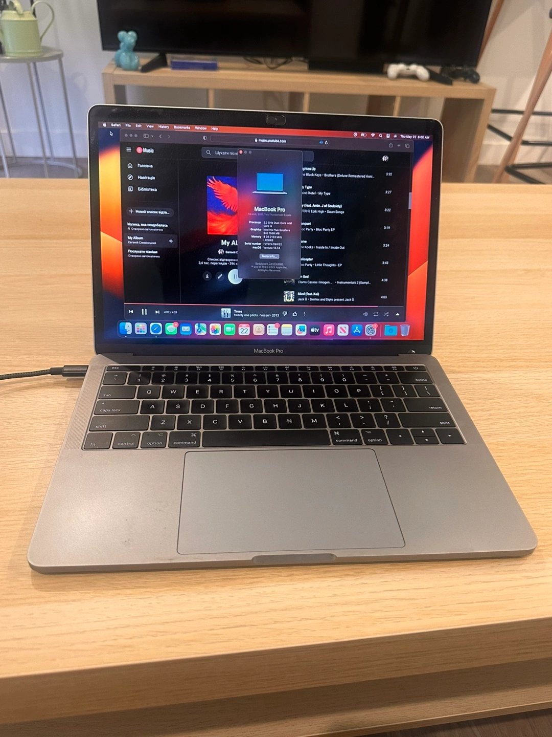 Selling a MacBook Pro 13-inch from 2017. It has a 2.3 GHz Dual-Core Intel Core i5 processor, Intel Iris Plus Graphics 640 1536 MB, and 8 GB 2133 MHz LPDDR3 memory. It also comes with a charger