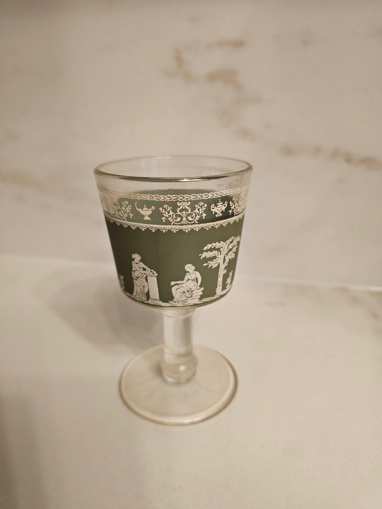 Selling a lovely Wedgwood Jasperware wine glass! It features the classic Wedgwood design in a beautiful green colour. Perfect for adding a touch of elegance to your table setting or collection
