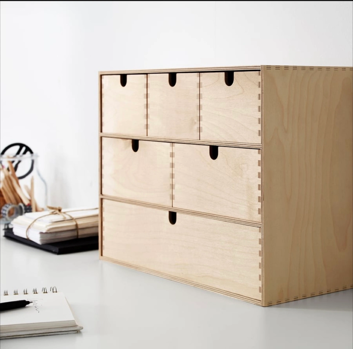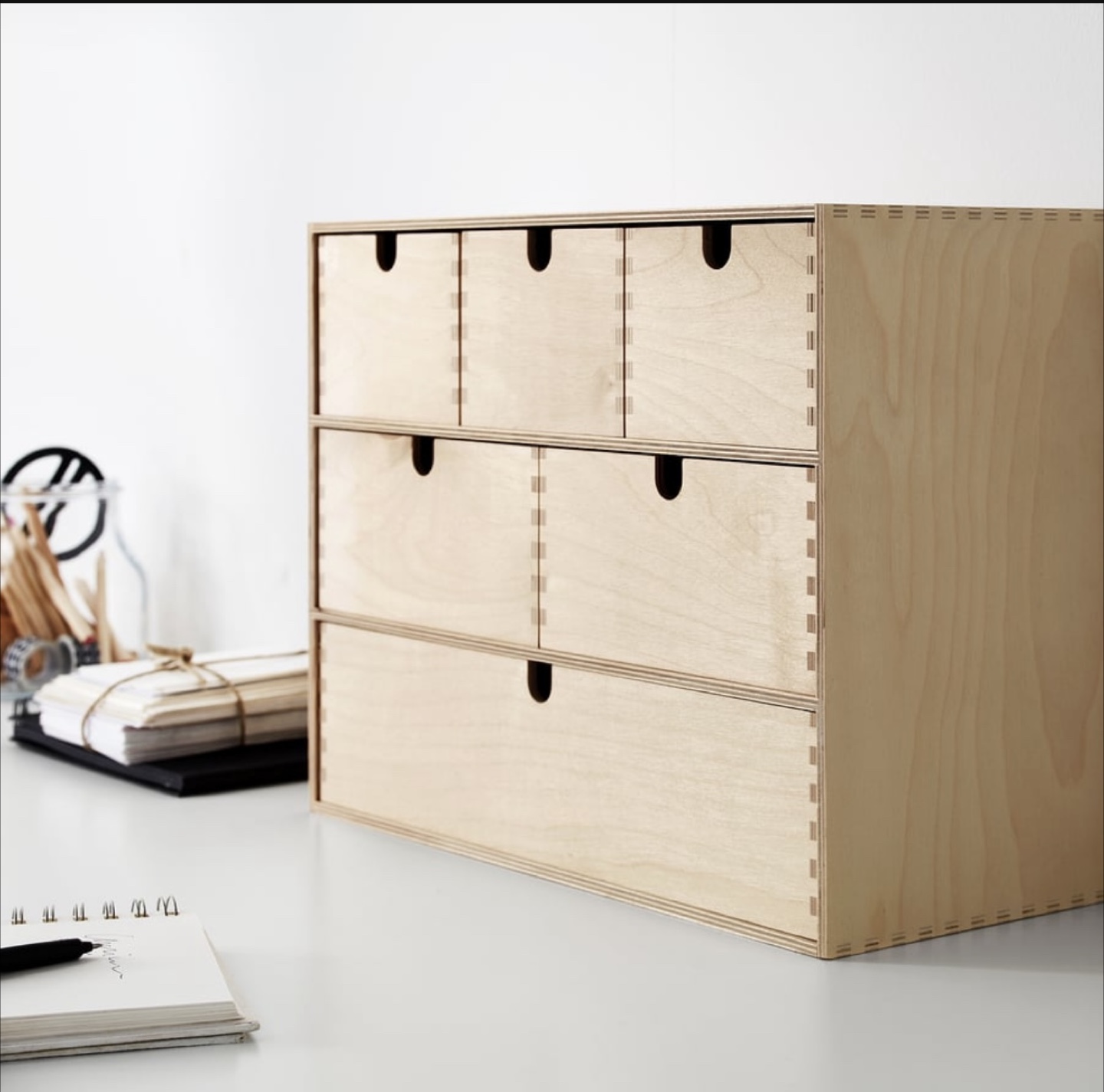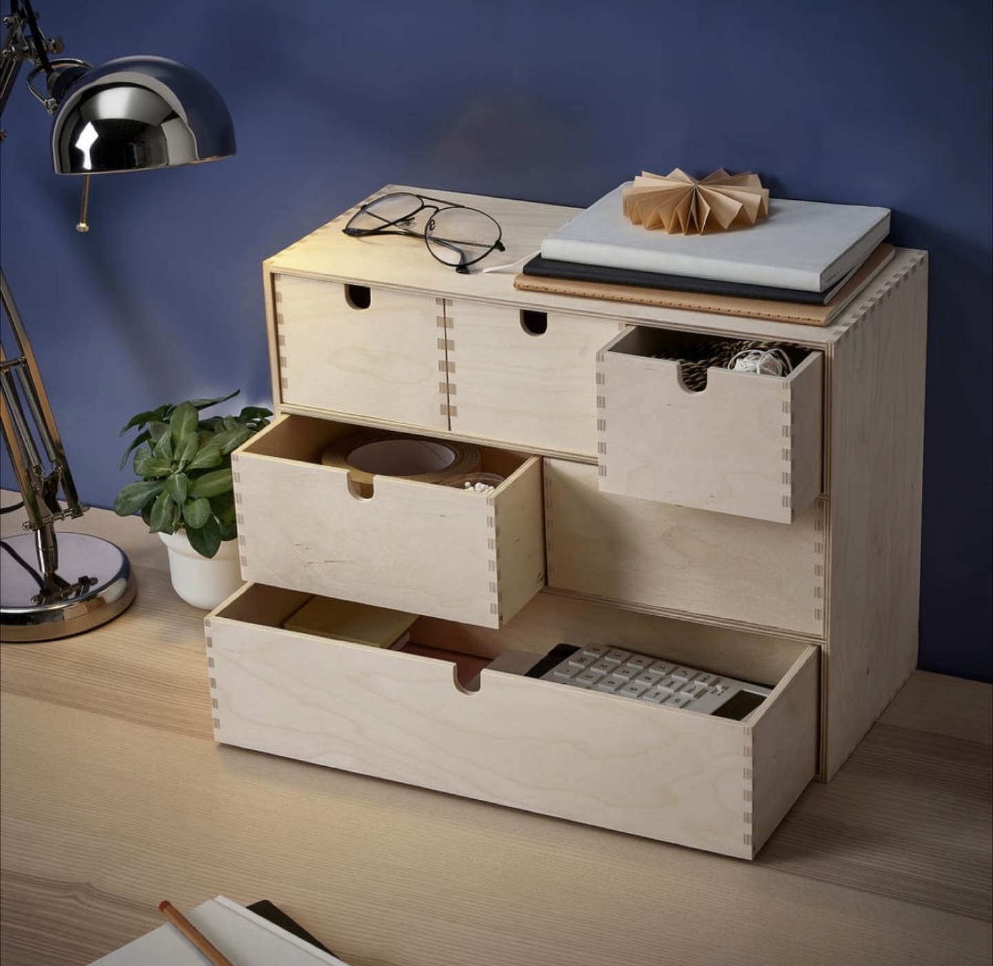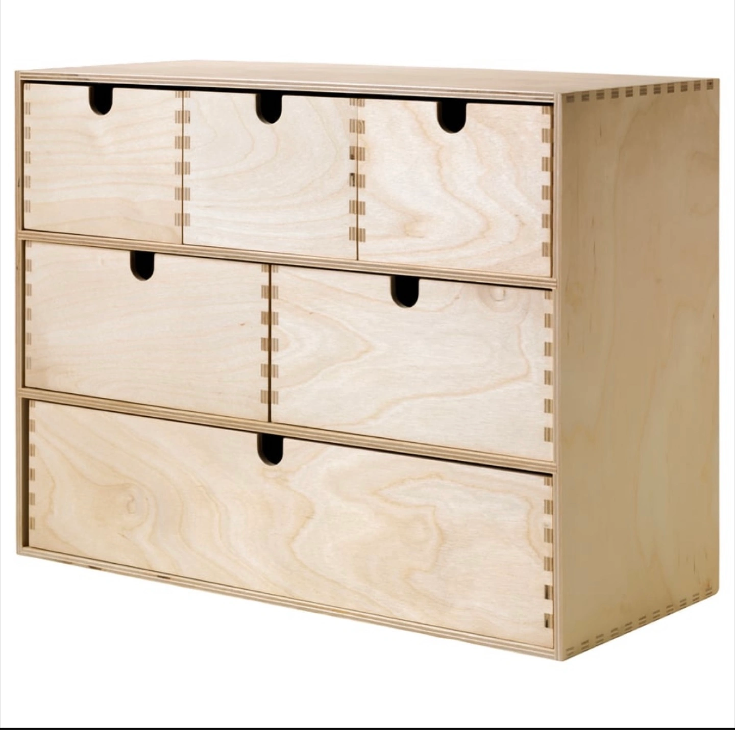 Looking to declutter? This Ikea Moppe mini chest of drawers is perfect for organizing small items! Made of birch plywood, it features six drawers (two small at the top and one larger one at the bottom) to keep your space tidy. Dimensions are 42 cm (16 1/2") wide, 18 cm (7") deep, and 32 cm (12 1/2") high