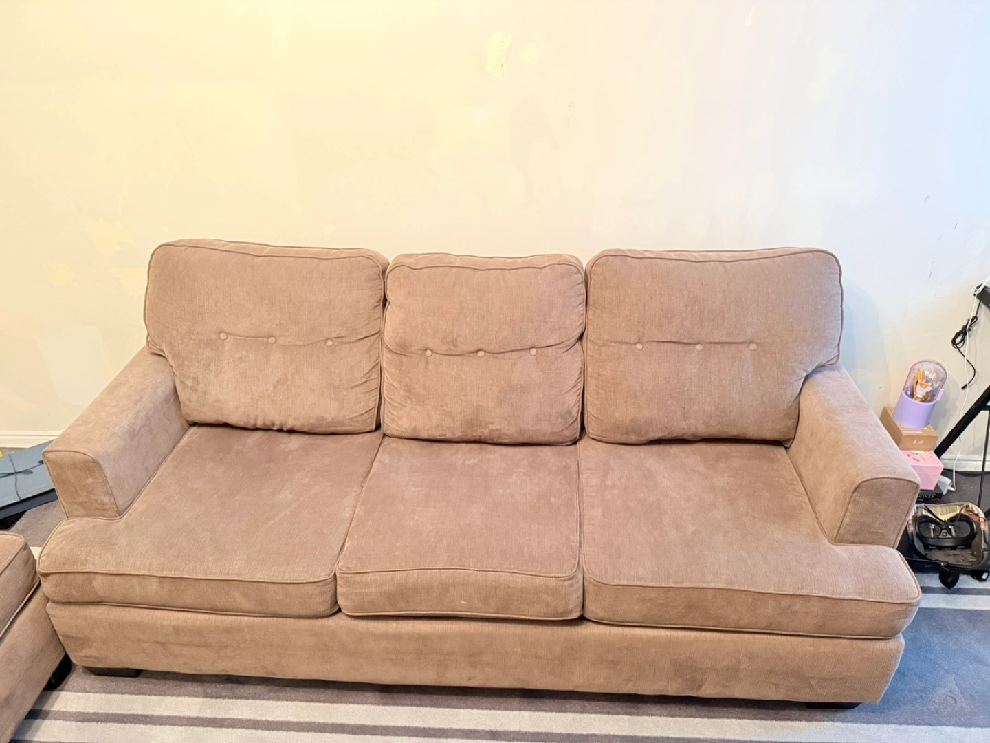 Selling a comfy brown sofa set! It includes a three-seater sofa and a love seat. Perfect for a living room or family room. The set is in good condition and ready for a new home!