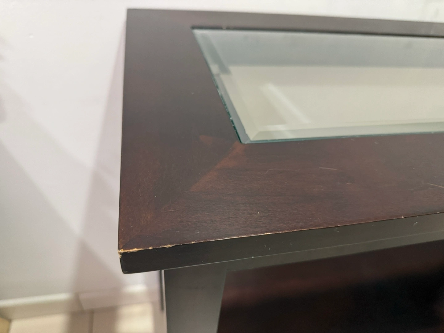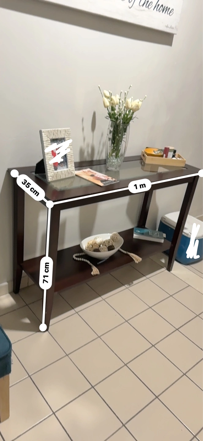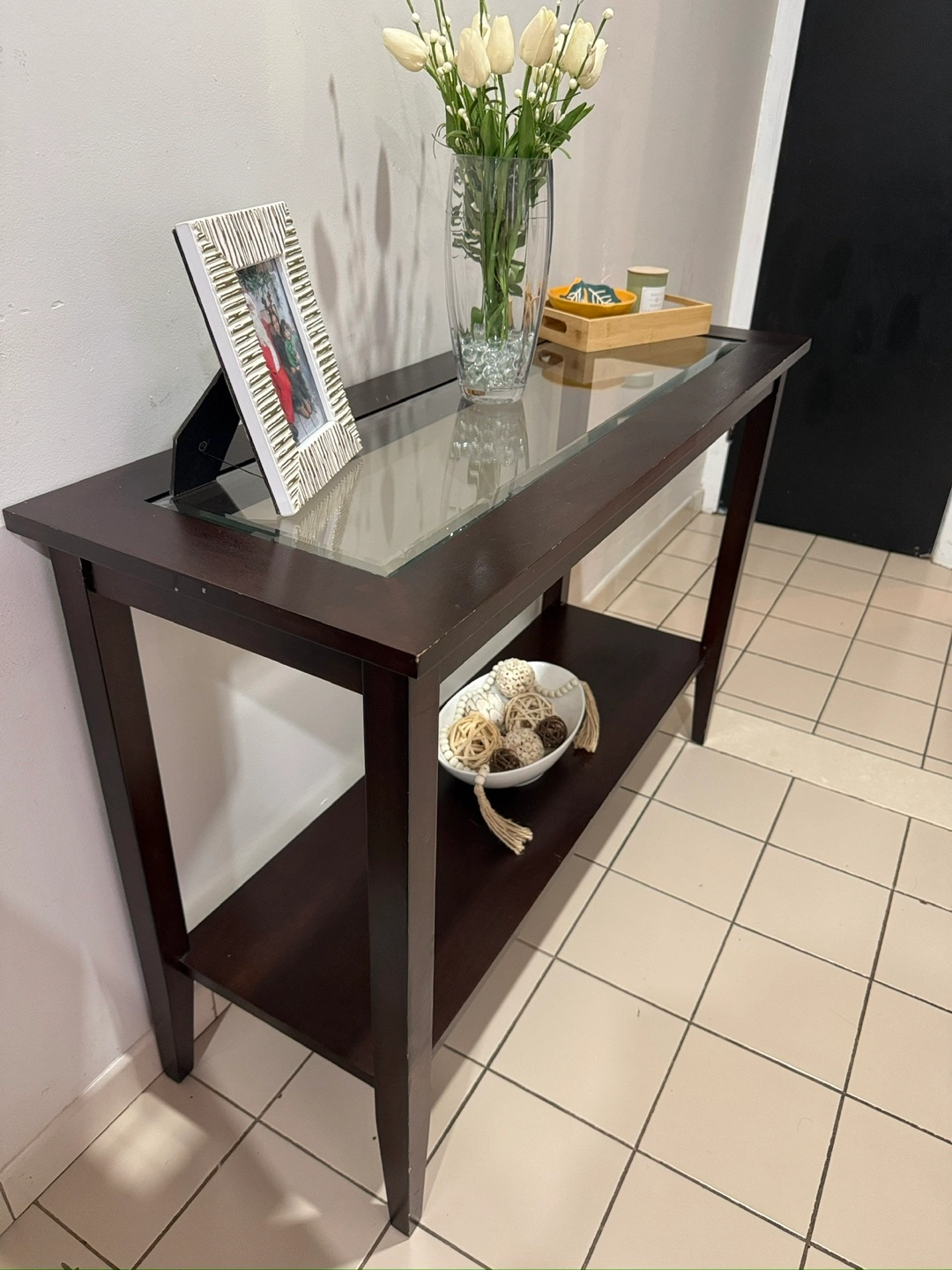 I'm selling a console table with a glass top. It features a dark wood finish and a lower shelf for extra storage or decor. It's perfect for an entryway or living room. There are some signs of wear and tear, but it's still in good condition.