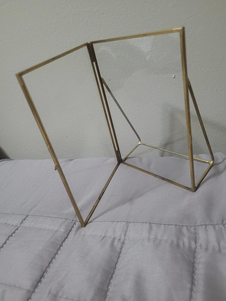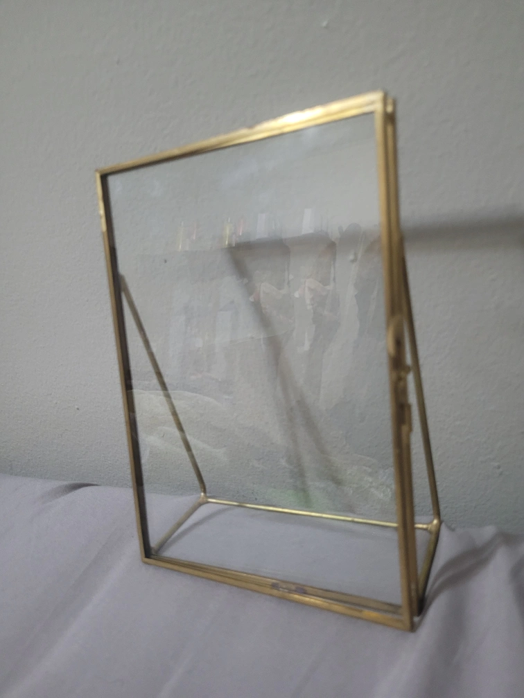 A simple and stylish picture frame! It features a gold metal frame with glass panels, perfect for displaying your favourite photos or artwork. It's in great condition and ready to add a touch of elegance to your space