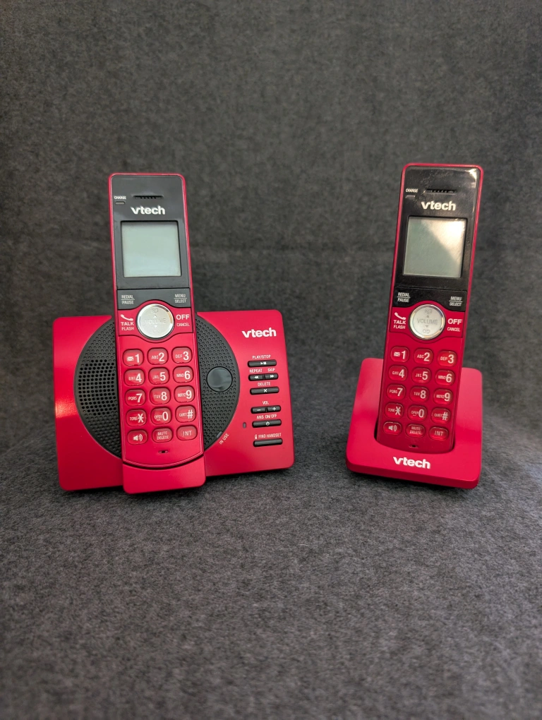 Selling a VTech cordless phone set in red! It includes two handsets and a base station. Perfect for home or office use