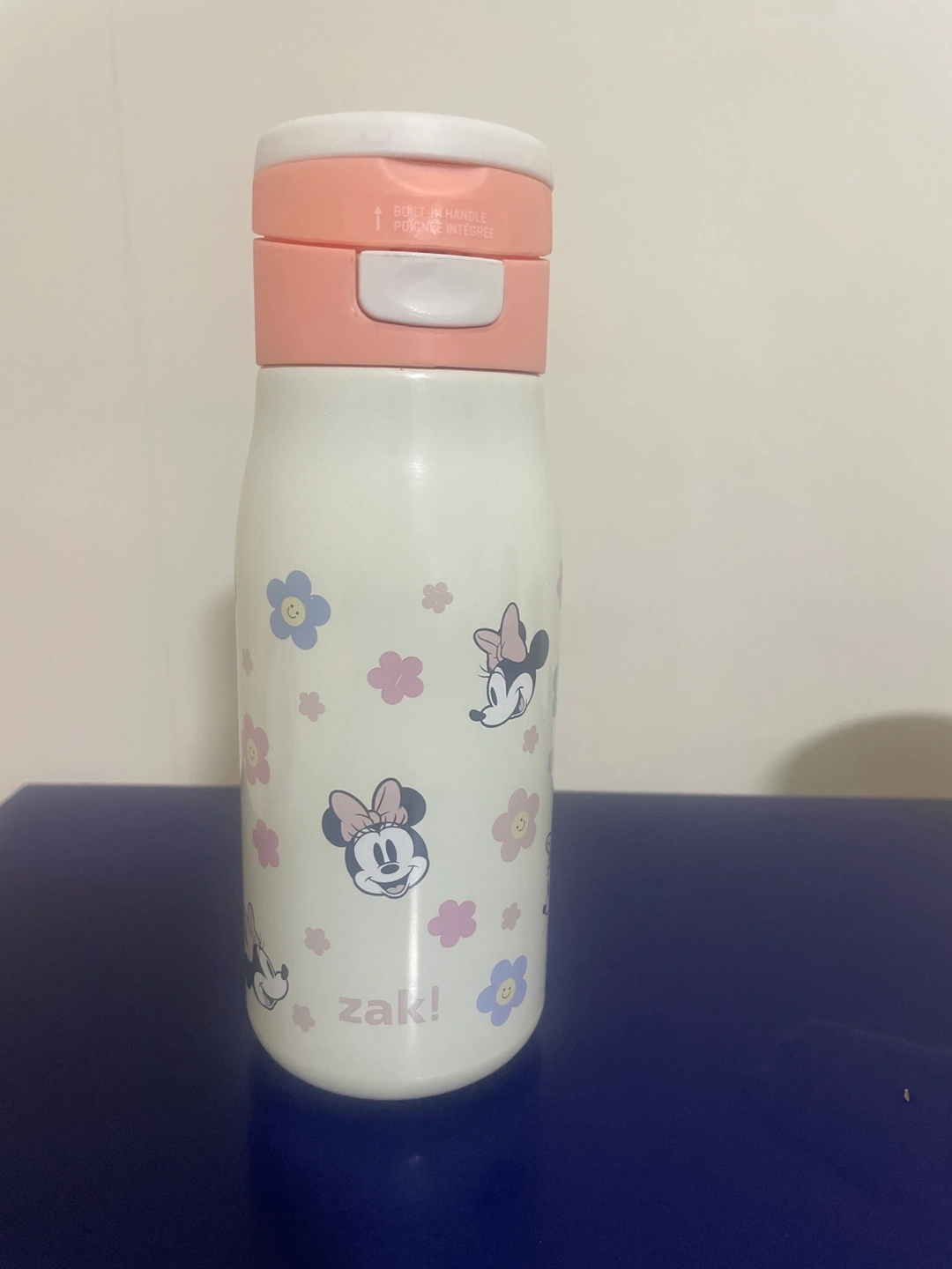 Here's a cute Zak! water bottle featuring Minnie Mouse and floral designs! It has a built-in handle and a pink and white colour scheme. Perfect for keeping hydrated on the go!