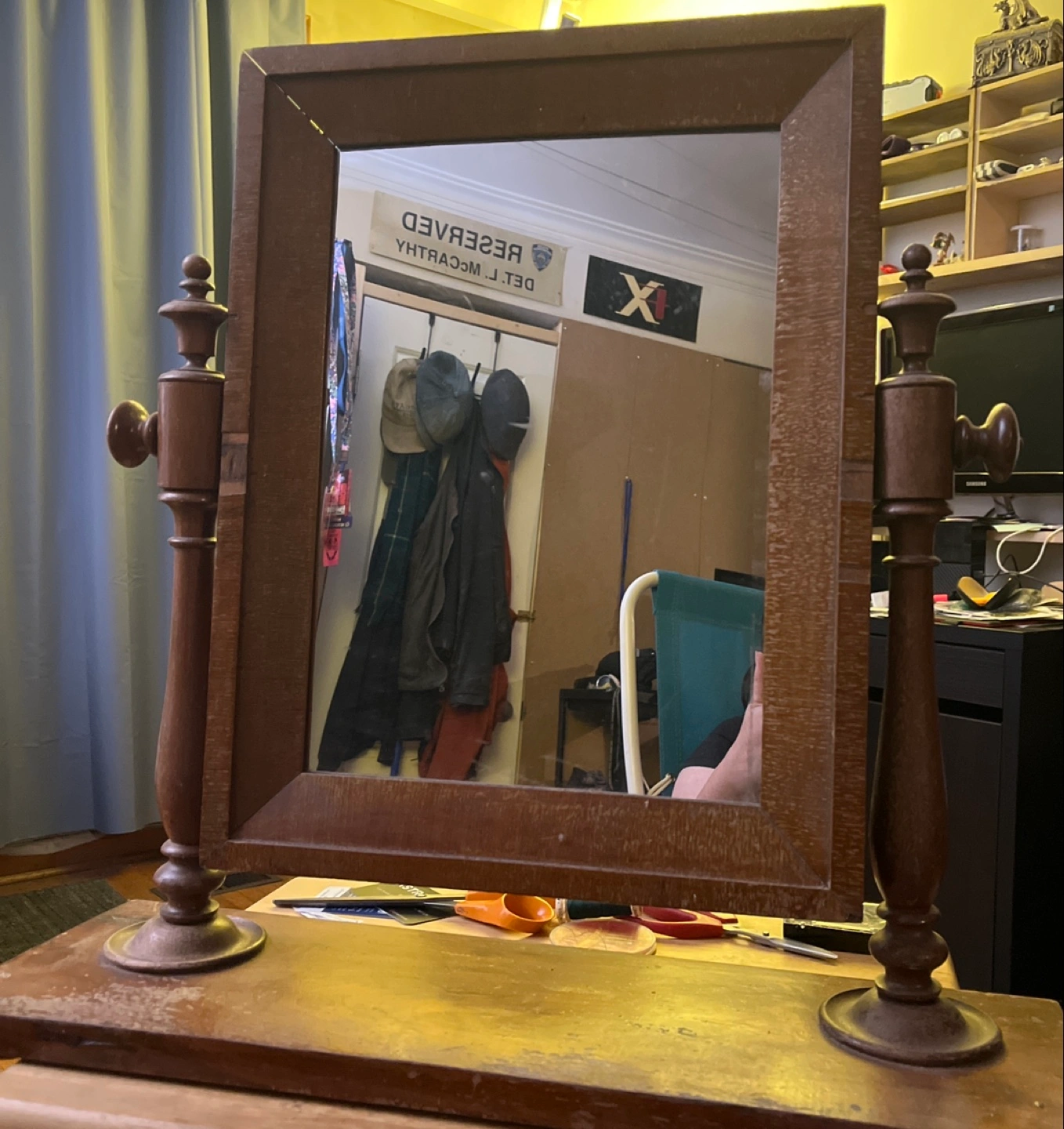 Selling a vintage vanity mirror with a beautiful wooden frame. It was used as a prop so the glass has been switched with plexiglass.