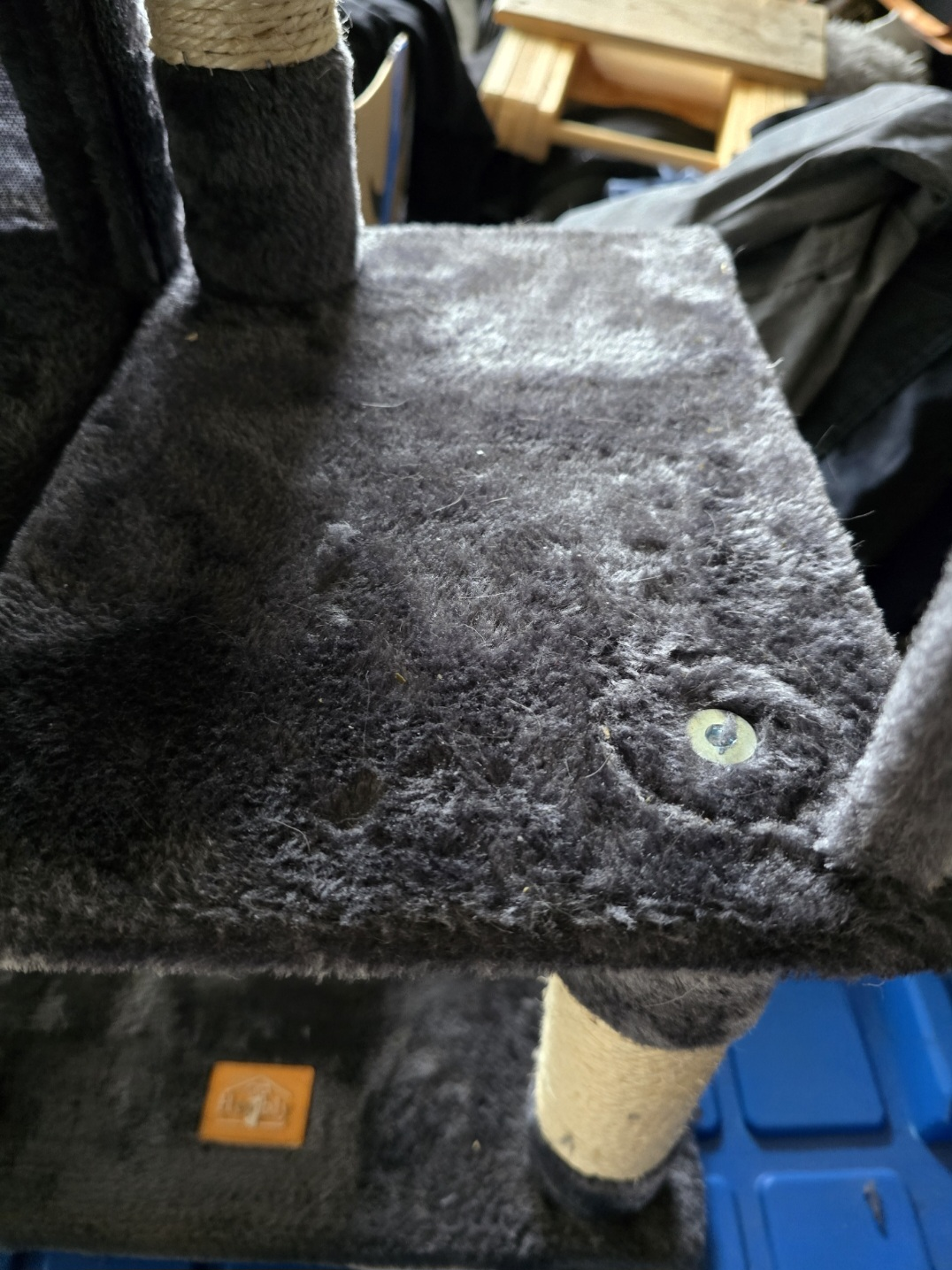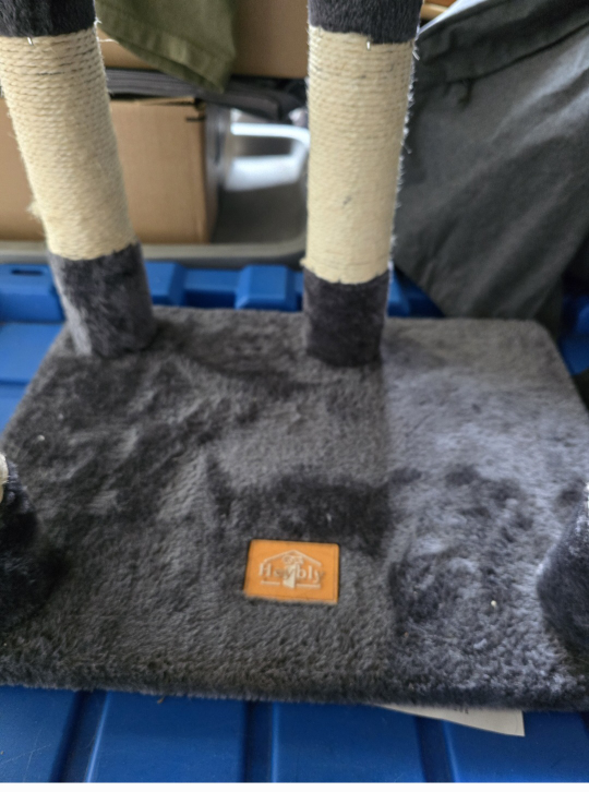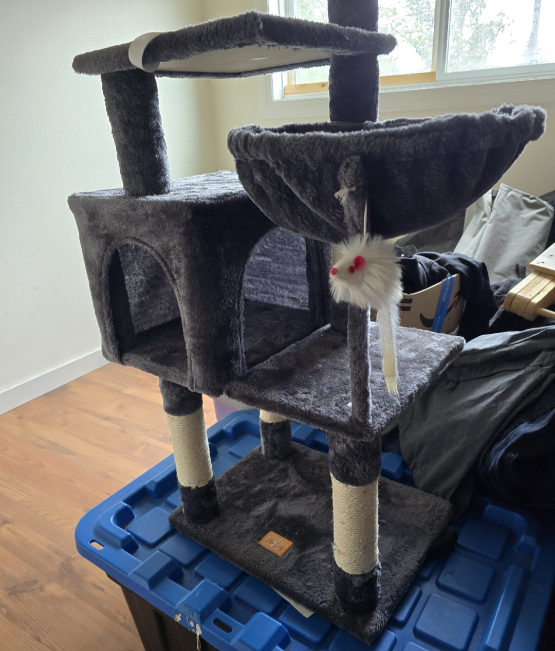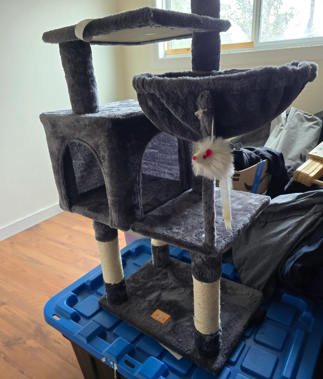 Selling a Lovbly cat tree. It's new we put it together to show. Its ready for a new feline friend to enjoy! It features multiple levels for climbing and playing, plus scratching posts to keep your kitty's claws in good shape