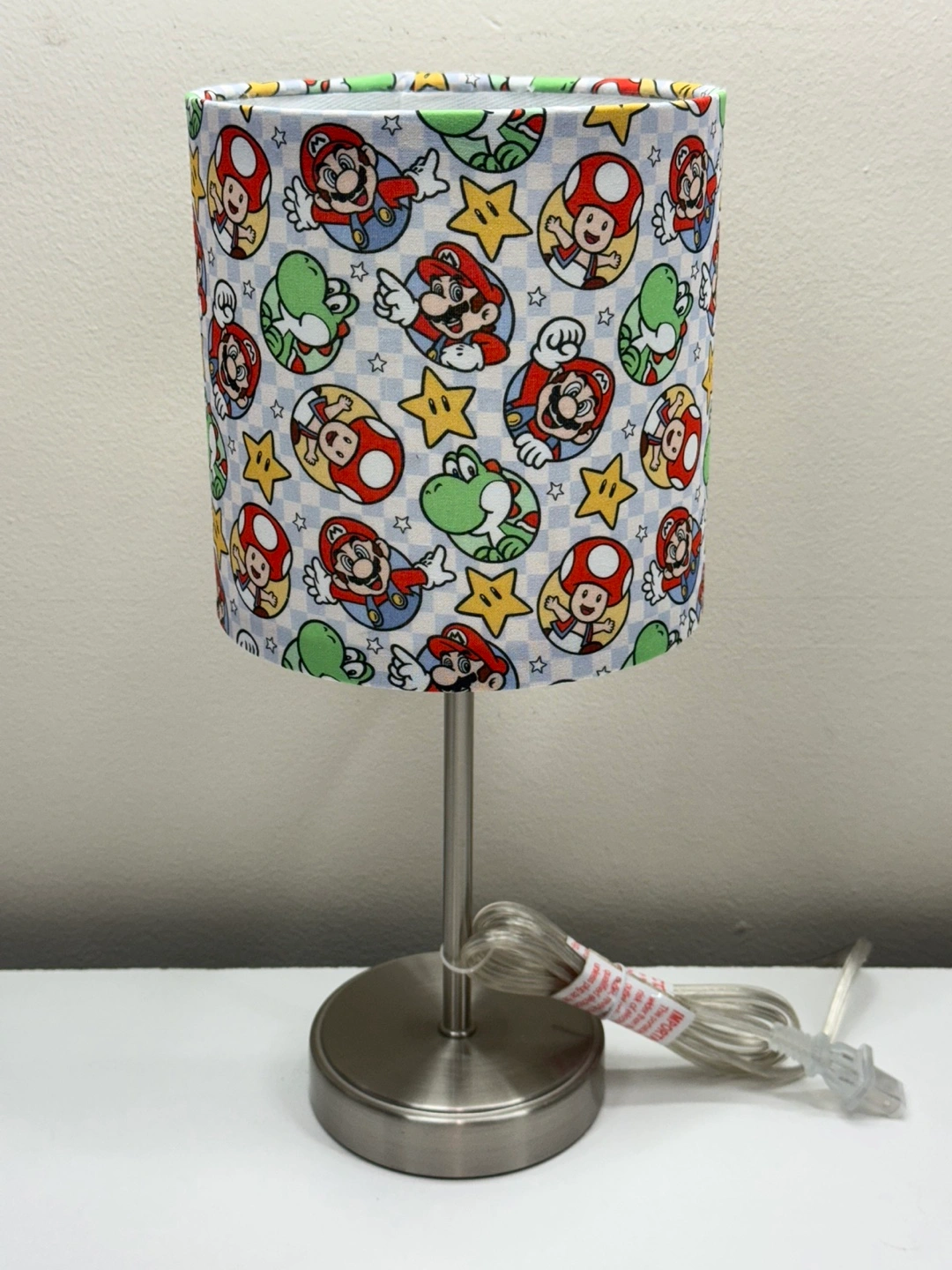 Here's a cute table lamp with a Mario and friends design! It features Mario, Luigi, Yoshi, mushrooms, and stars on a light blue checkered background. Perfect for a kid's room or any Nintendo fan