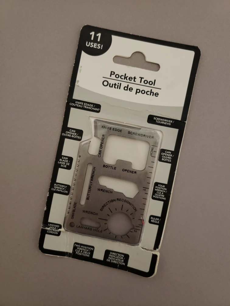 This pocket tool features 11 different uses! It includes a knife edge, screwdriver, can opener, bottle opener, saw blade, butterfly wrench, ruler, lanyard hole, and more! Perfect for camping or keeping in your car
