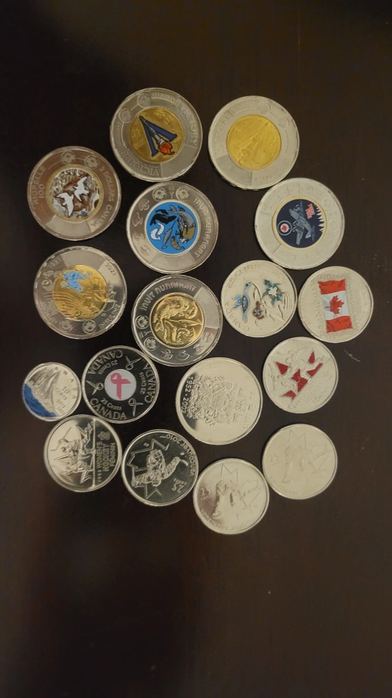 A collection of assorted Canadian coins, including toonies, loonies, quarters, and more! These coins feature various designs and dates, perfect for collectors or anyone looking to add to their spare change to use as future premium!!!