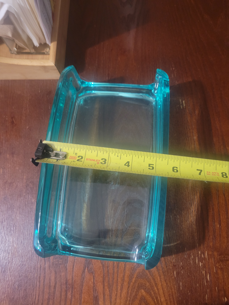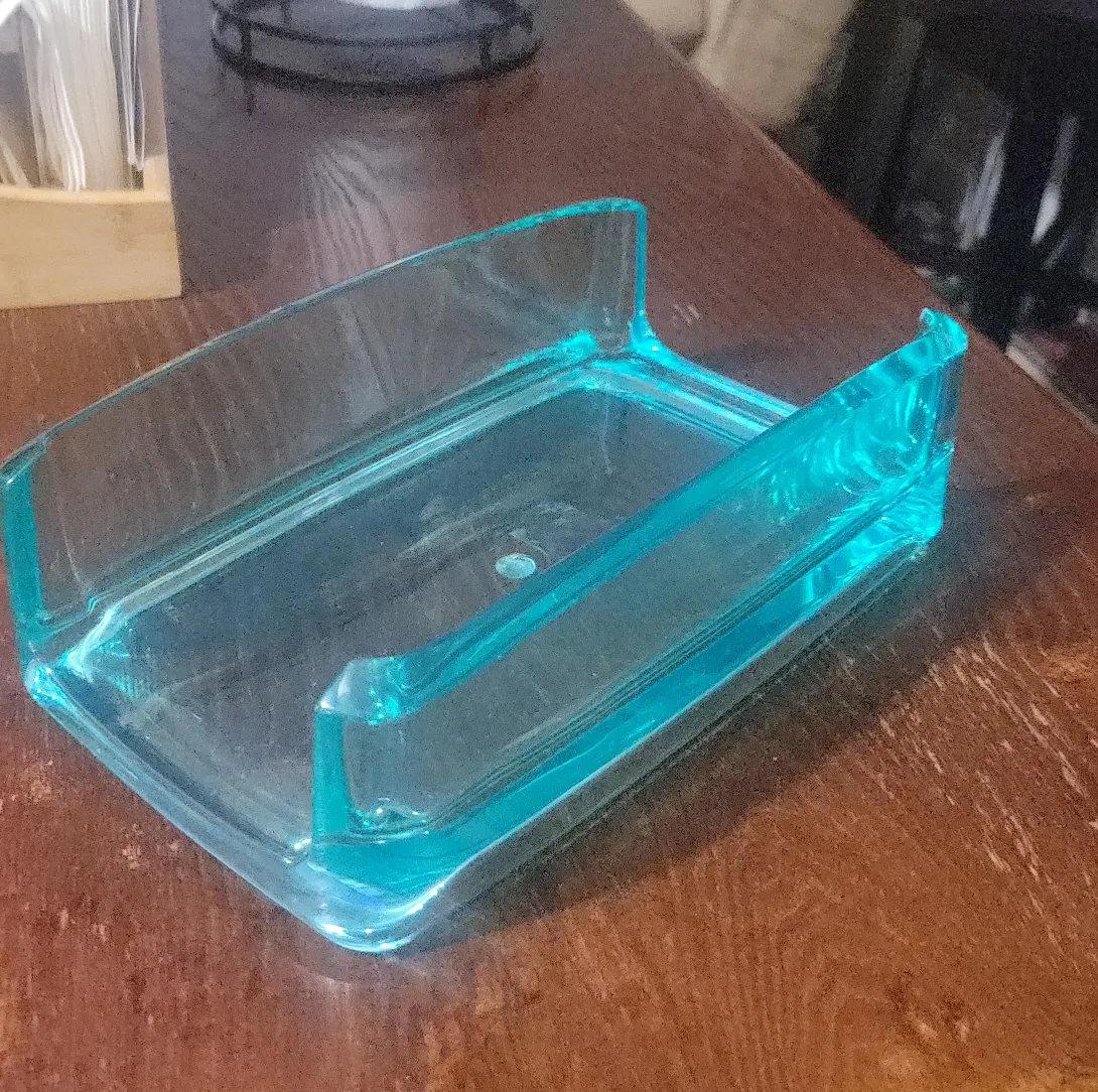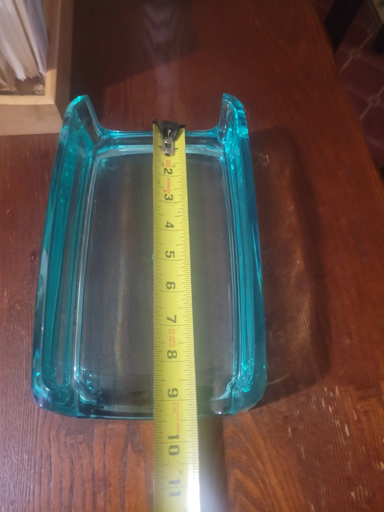 Here's a cute aqua blue glass napkin holder! It measures approximately 9.5 inches long, 5.5 inches wide and 3 inches tall. It's in great condition and ready for a new home
