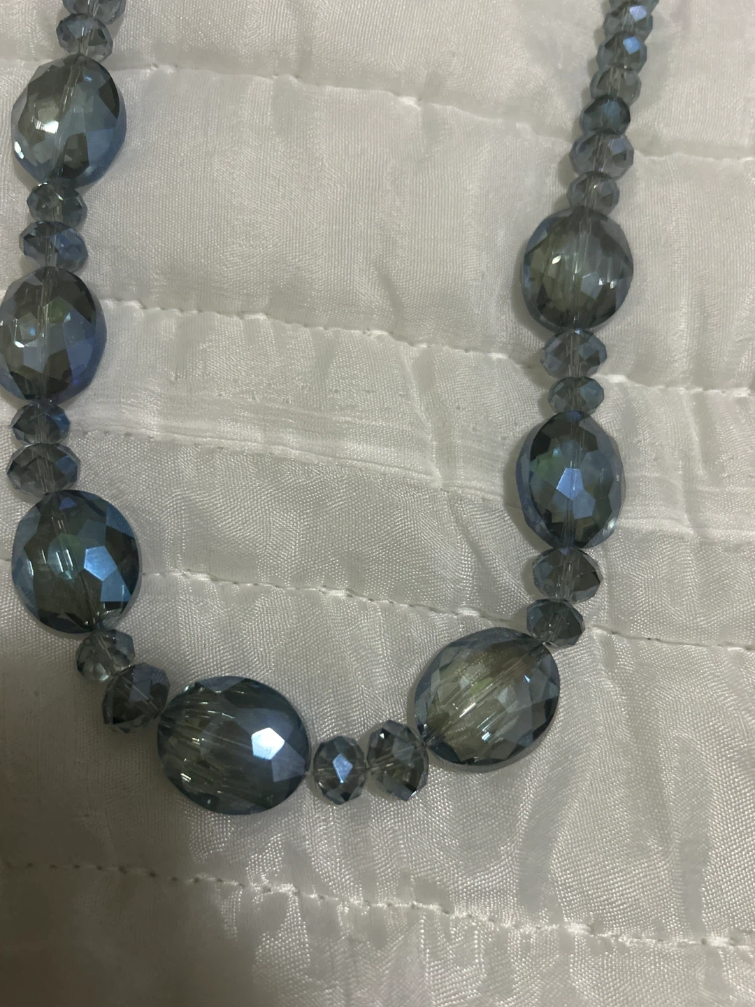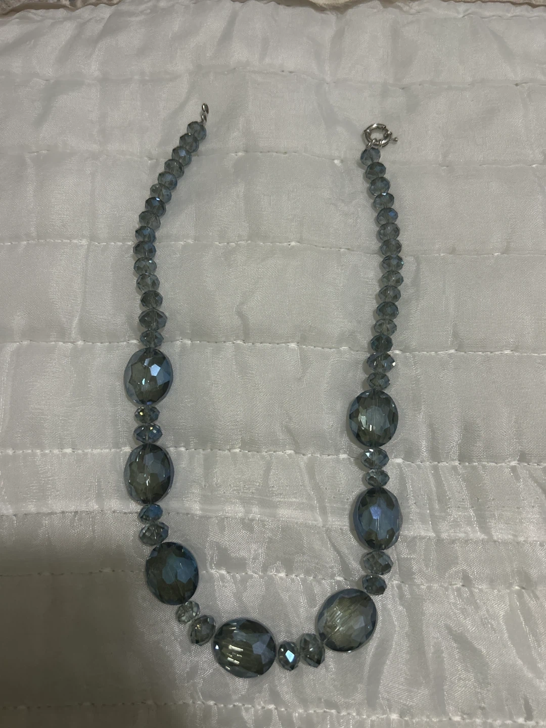 A pretty blue beaded necklace that would add a nice touch to any outfit. The beads are a lovely shade of blue and catch the light beautifully. It's in great condition and ready to be worn