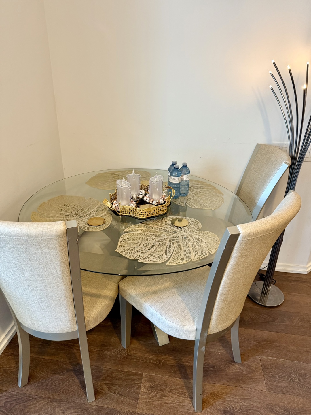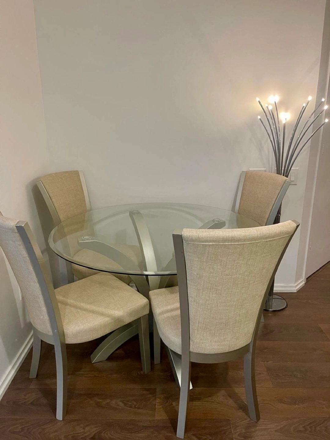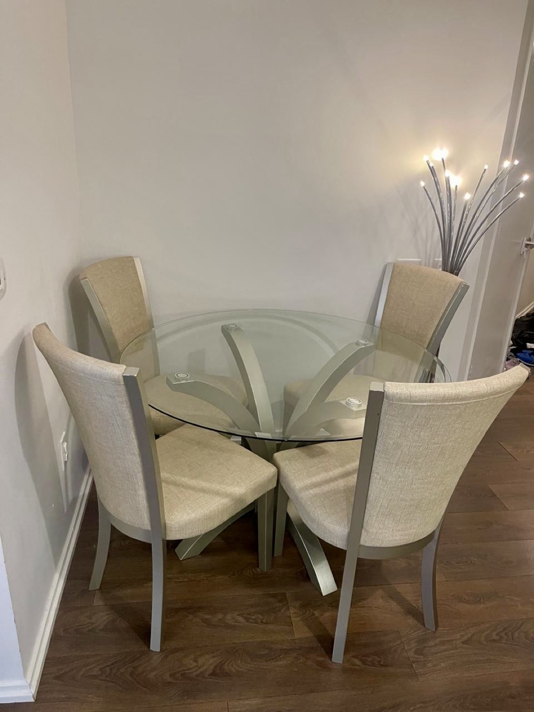 Selling a round glass dining table with four chairs. The chairs have a neutral-toned waterproof fabric and silver wooden frames. The table has a unique silver base that complements the chairs. Modern style . Sturdy. Perfect for a small dining area or kitchen nook!