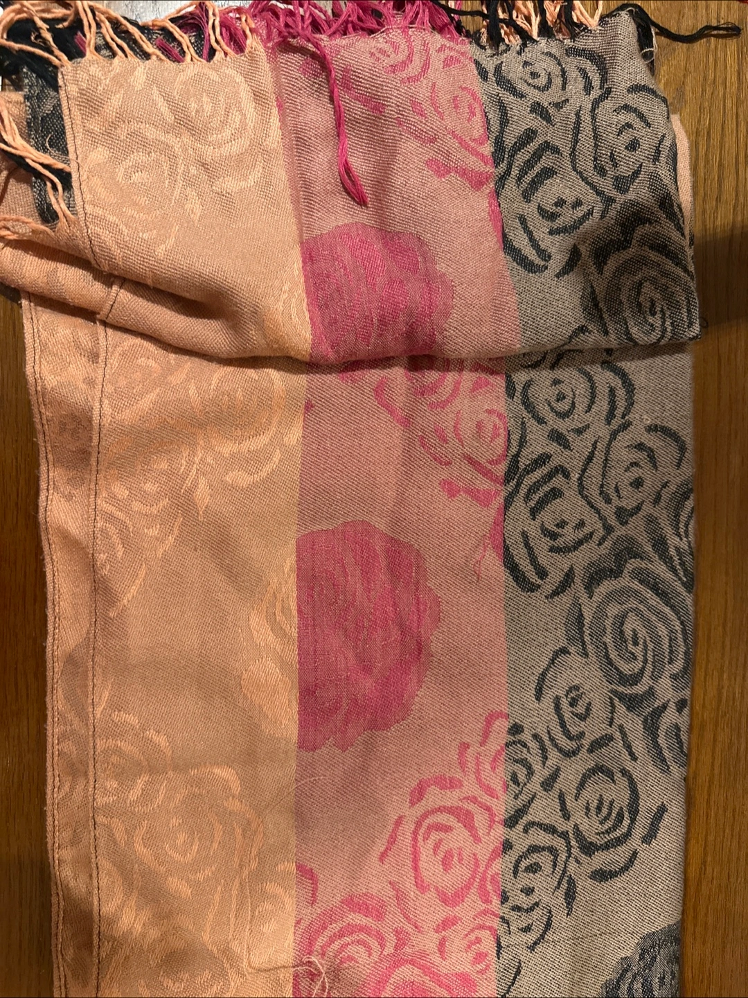 A lovely scarf with a floral pattern in shades of beige, pink, and grey. It's in great condition and ready to add a touch of elegance to your outfit