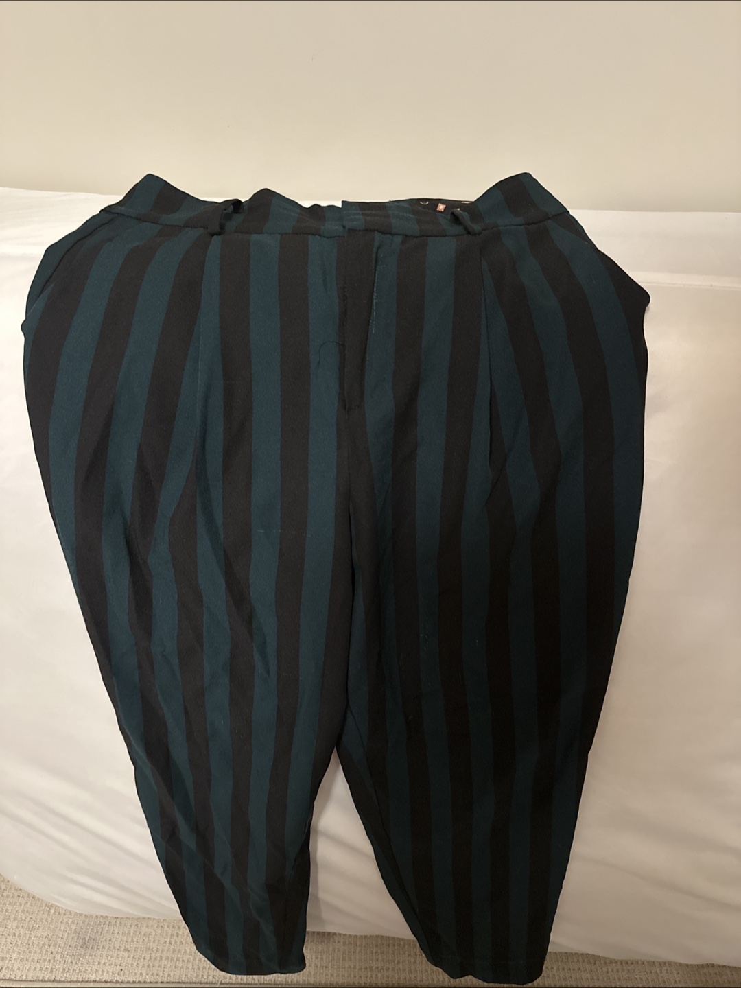 These are a pair of striped pants, featuring a cool black and green colour scheme. They're in great condition and ready for a new home!