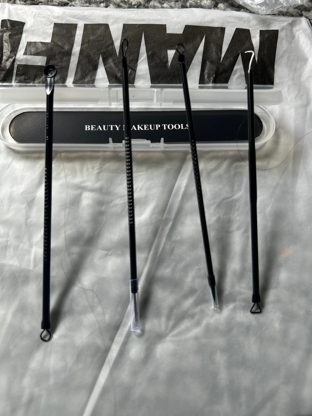 I'm selling a set of beauty makeup tools. These tools appear to be designed for facial cleansing and blemish extraction. They come in a clear plastic case for easy storage and organization