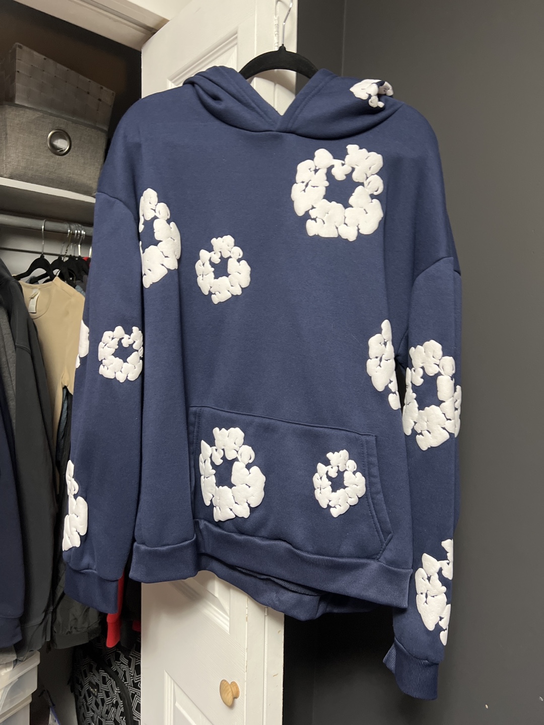 Here's a cozy blue Denim Tears hoodie! It's in great condition and ready for a new home. Perfect for adding a touch of style to your wardrobe.