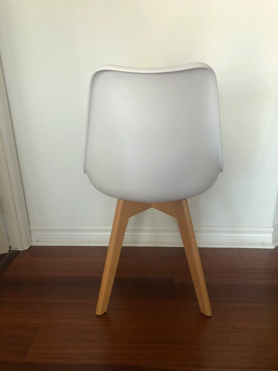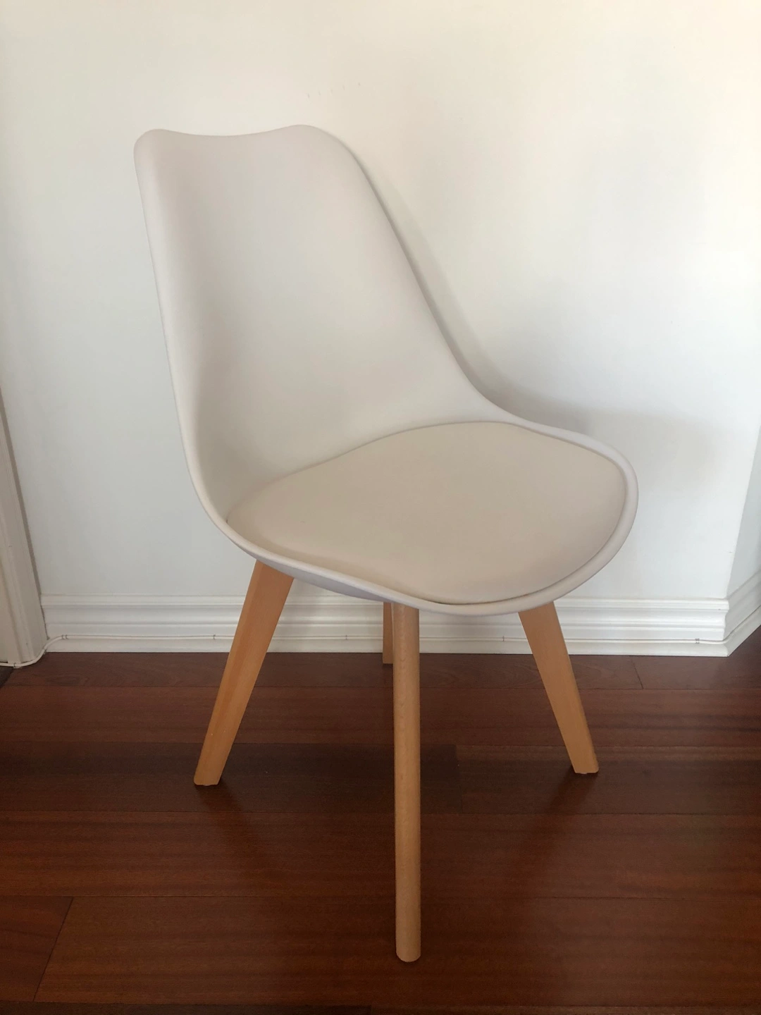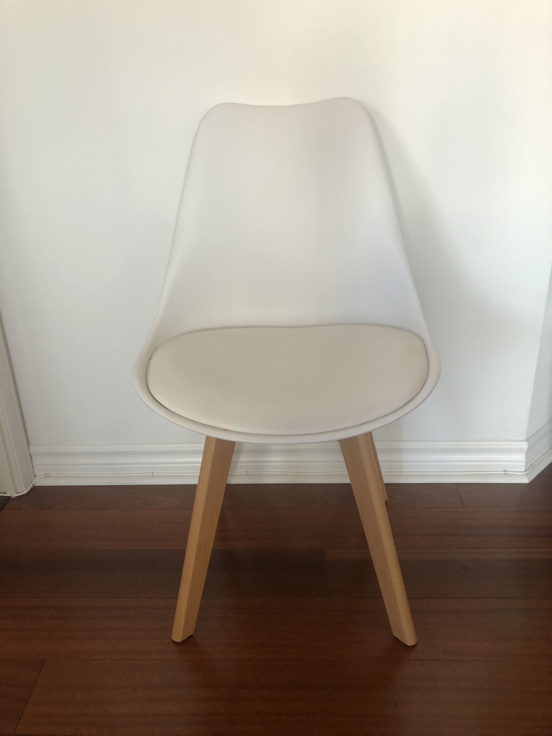 White tulip-style dining chair. It's in great shape and would look lovely in any dining room or kitchen. The chair has a comfortable seat and sturdy wooden legs