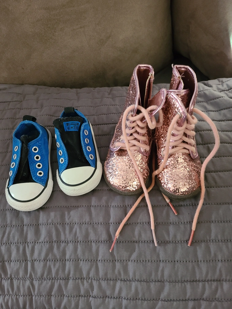 A pair of baby/toddler shoes and glitter boots. The shoes are Converse All-Stars in blue and black. The boots are a sparkly pink colour with laces, perfect for dressing up!