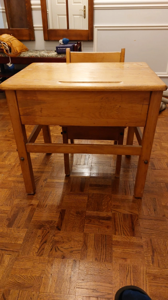 Antique solid grade school wooden desk with chair. Made with reinforced metal rods. Very useful. Creative person who thinks out of the box could also use it for an accent/conversation piece, night table etc.