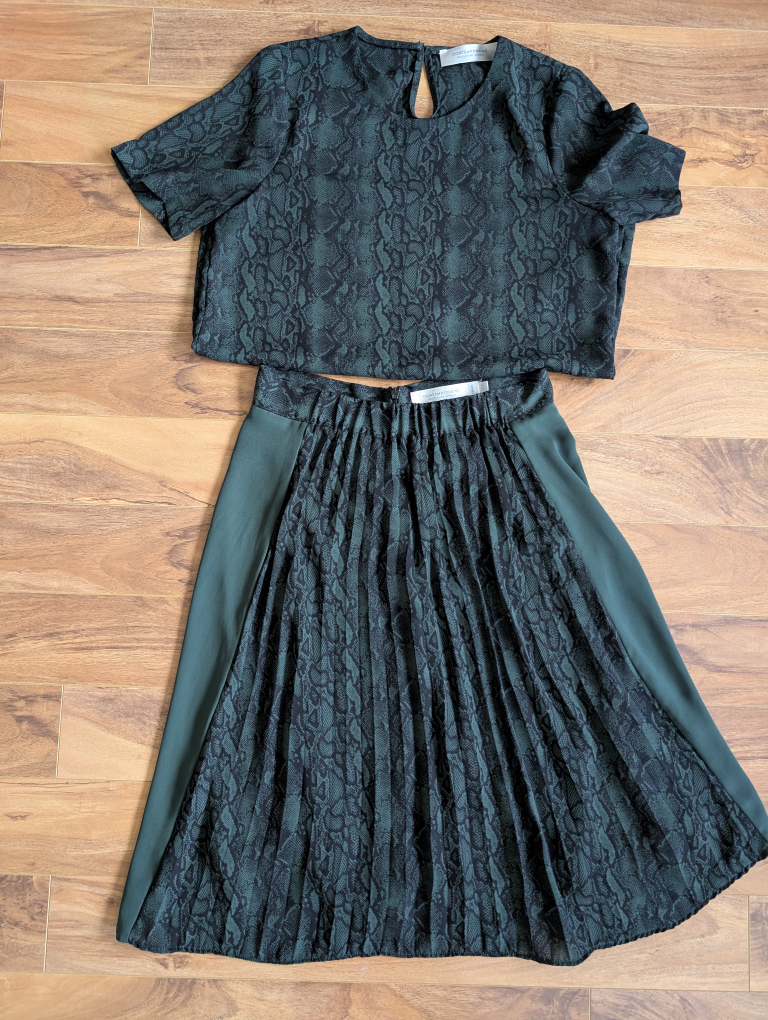 Selling a Contemporary brand skirt and top set. The set features a dark green snake print pattern. The skirt is pleated with a solid dark green panel on each side. Perfect for a night out or a special event! XS but can fit a Medium.