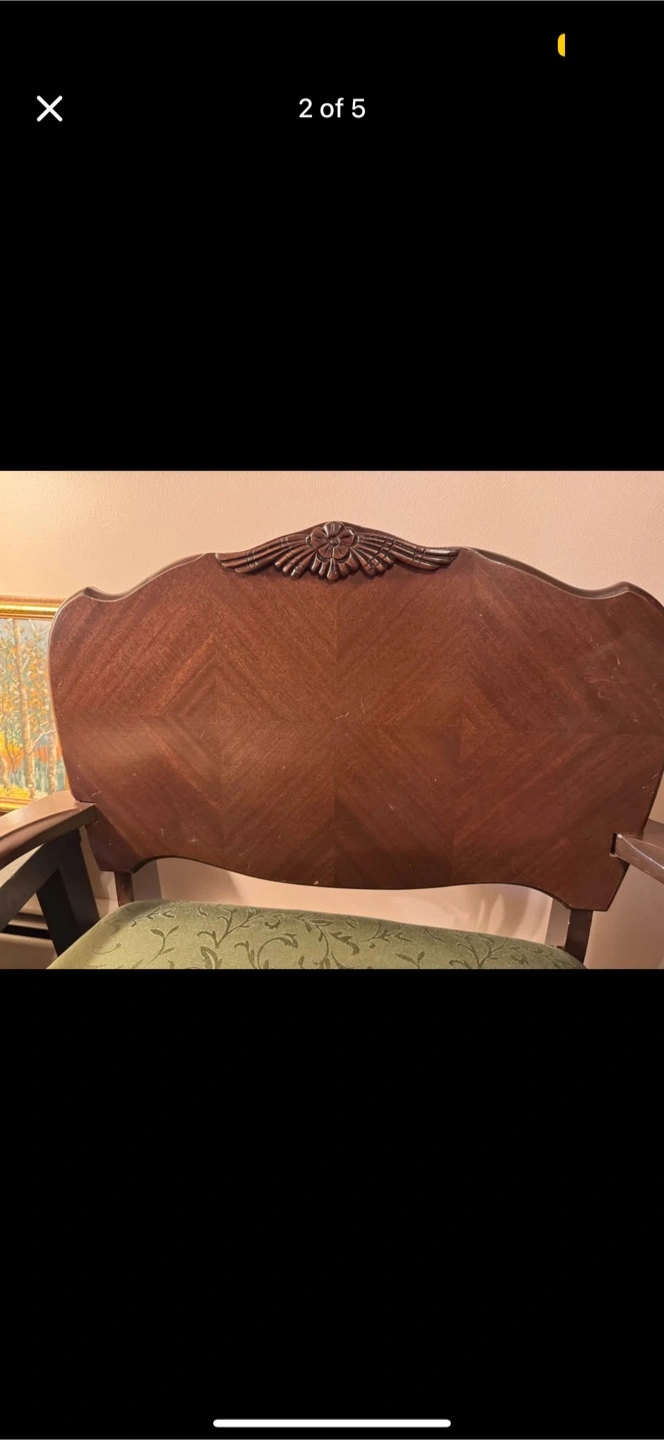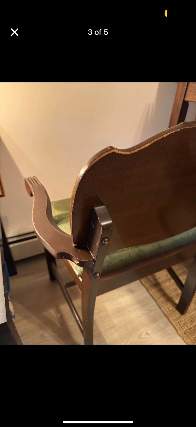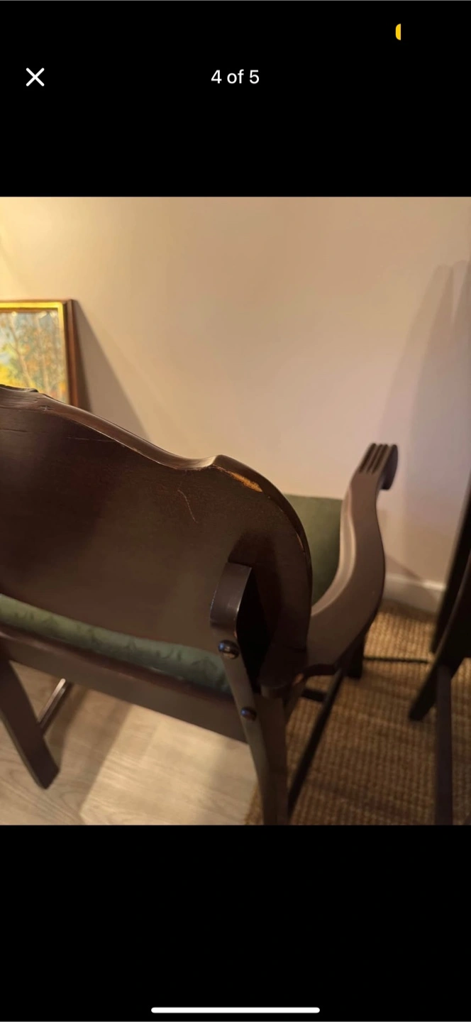 Showing its age with scuff marks and evidence of previous repairs done on the left arm, but it’s very sturdy. Almost zero signs of wear on the green upholstered cushioned seat.