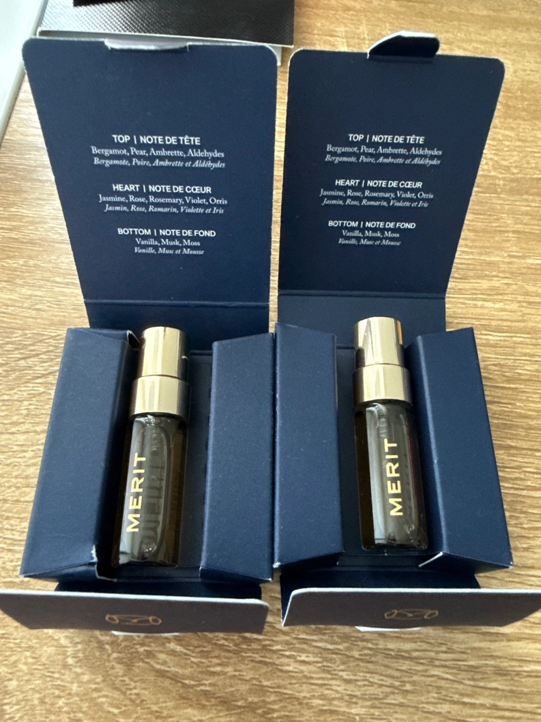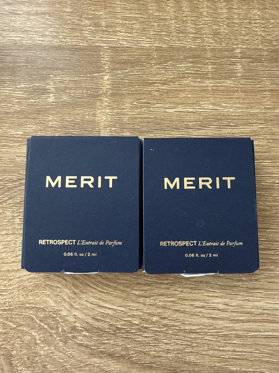Selling two MERIT Retrospect L'Extrait de Parfum samples! Each contains 0.06 fl oz / 2 ml. The top notes include Bergamot, Pear, Ambrette, and Aldehydes. The heart notes feature Jasmine, Rose, Rosemary, Violet, and Orris, and the base notes are Vanilla, Musk, and Moss