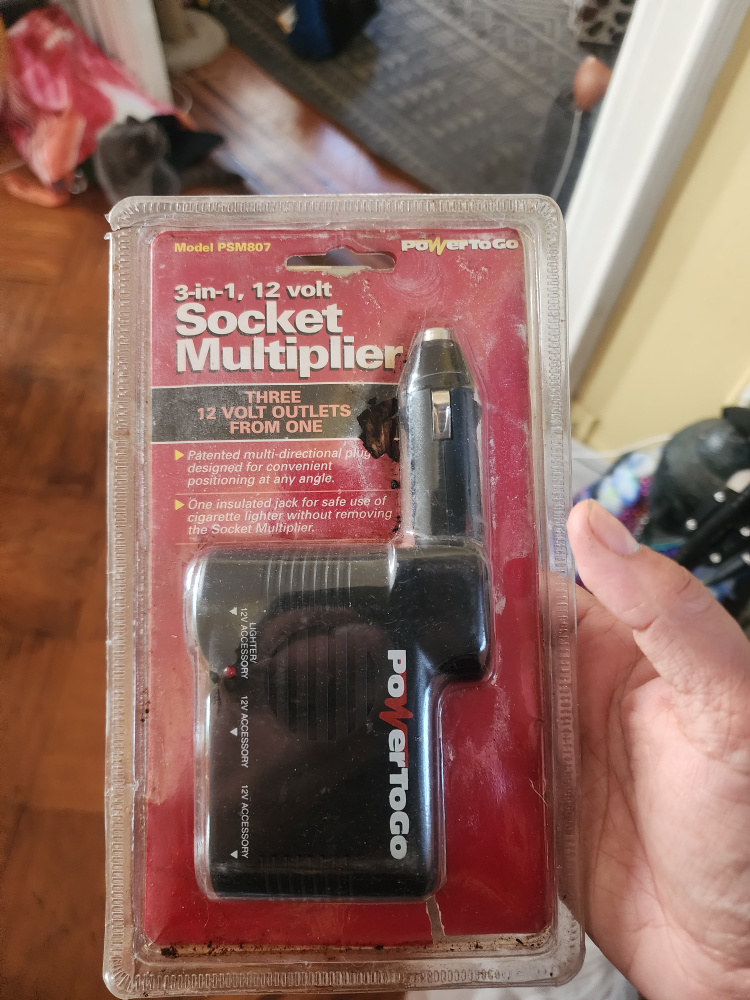 giving a Power To Go 3-in-1, 12 volt Socket Multiplier. It has three 12 volt outlets from one. It features a patented multi-directional plug designed for convenient positioning at any angle. There's also an insulated jack for safe use of a cigarette lighter without removing the socket multiplier. Model number is PSM807