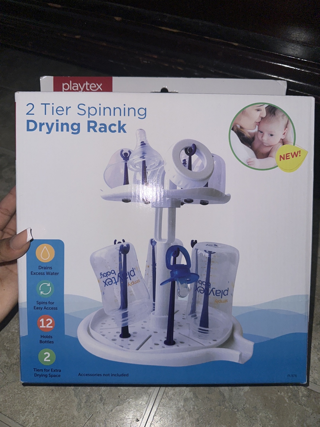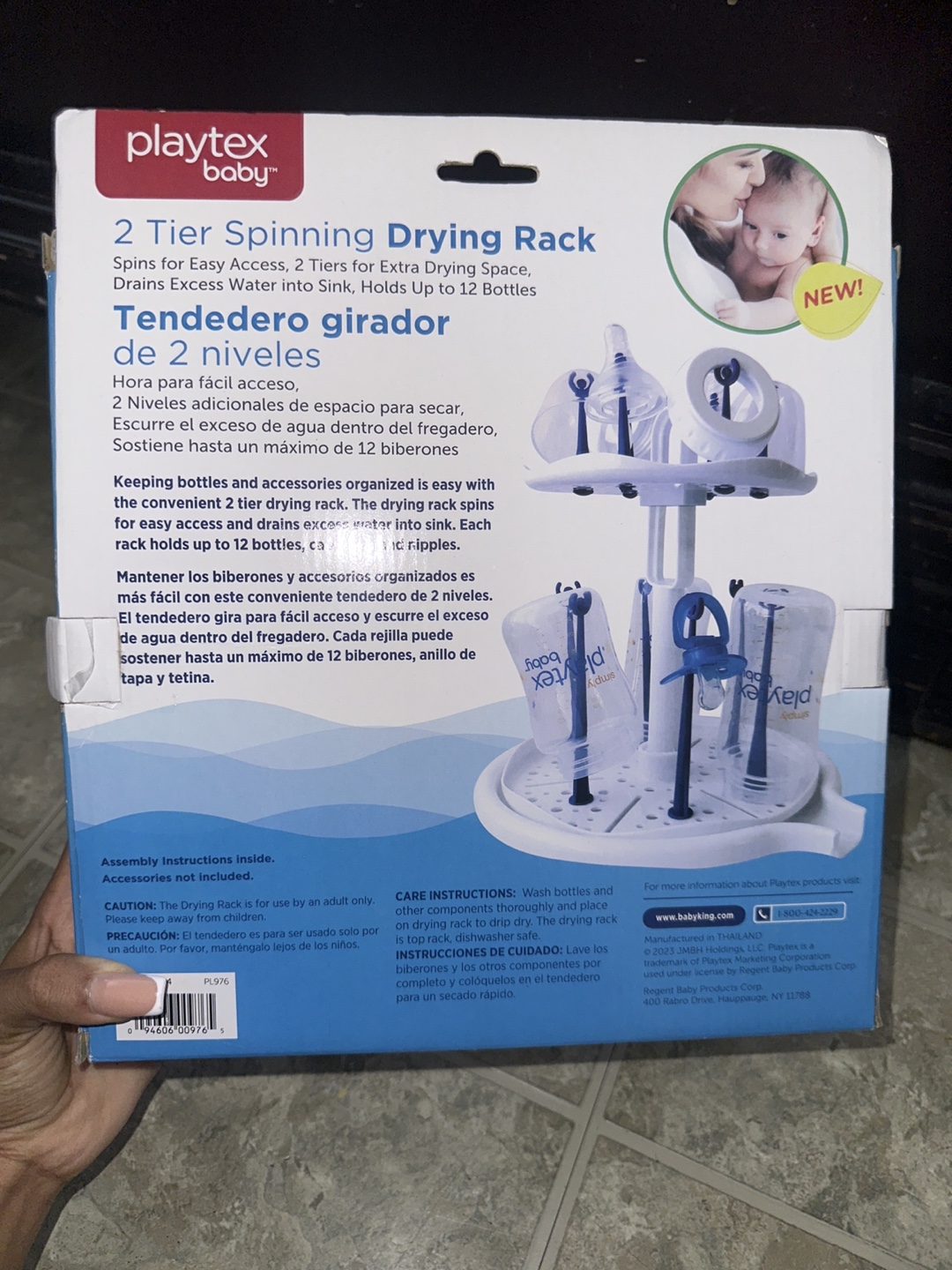 Playtex Baby 2 Tier Spinning Drying Rack! It spins for easy access and drains excess water into the sink. It holds up to 12 bottles and has 2 tiers for extra drying space. The box is included!