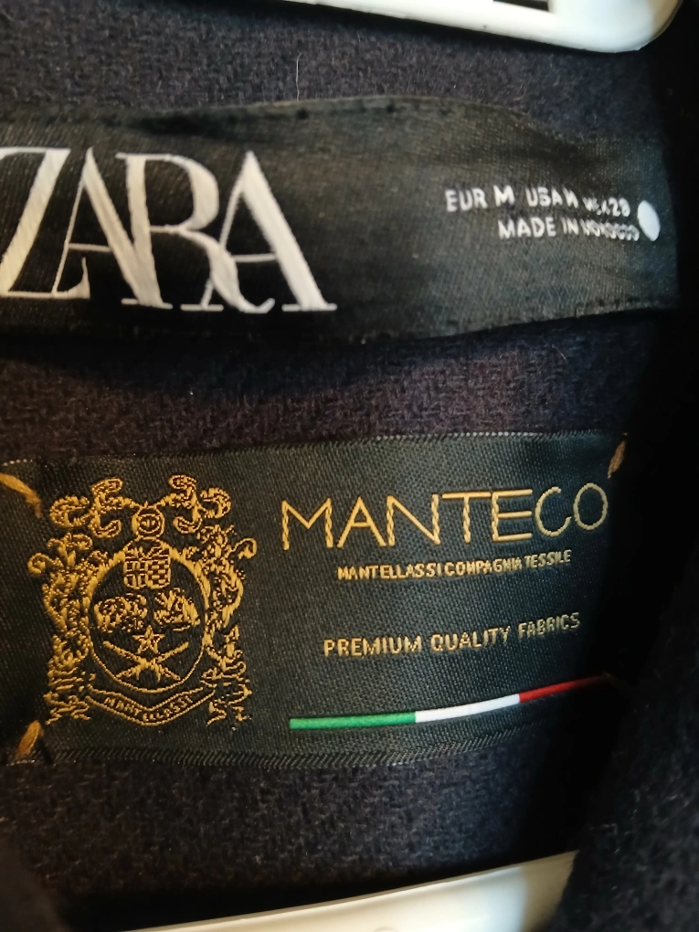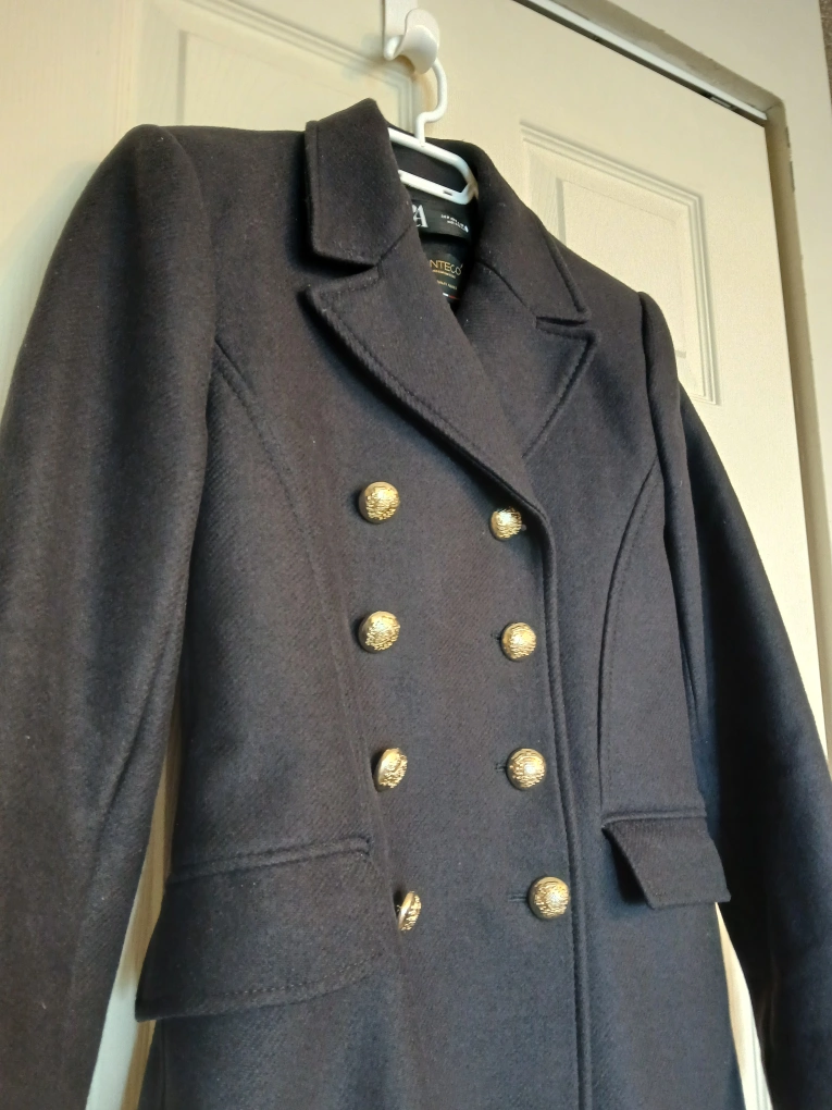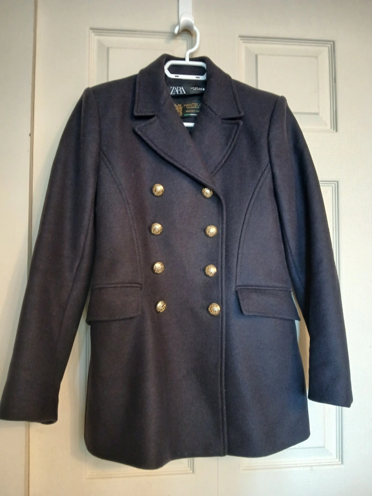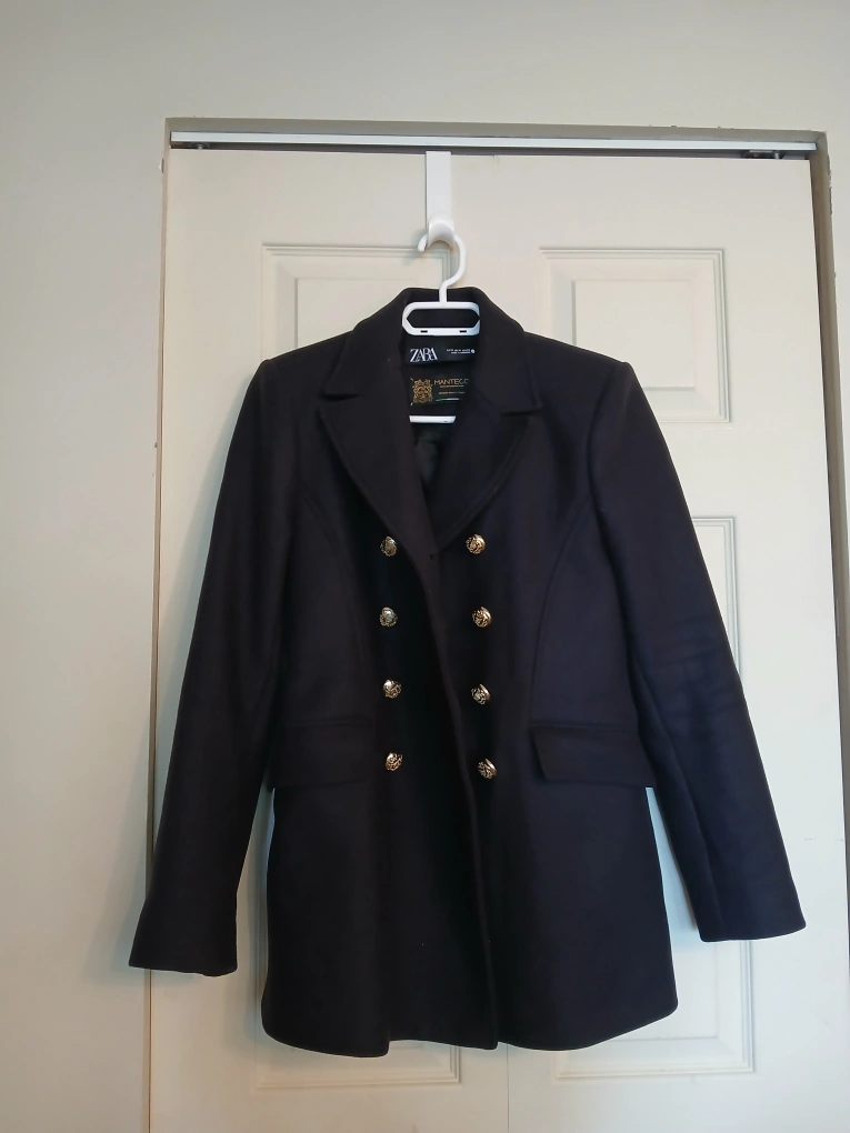Brand: Zara Manteco Type: Women's double breasted coat. Great for the fall. Very versatile. Has two pockets in front. Colour: navy blue with gold buttons Size: medium (M) Additional measurements: 45 cm pit to pit, 76 cm length Composition / material: wool blend; 100% viscose main interior Condition: Excellent