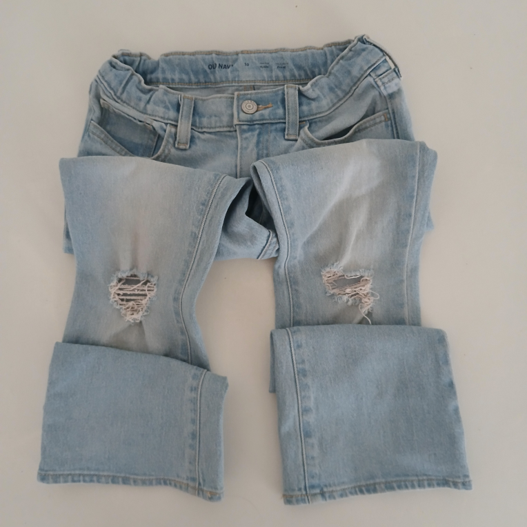 I'm selling a pair of Old Navy jeans in size 10. One pair is black and the other is light blue with rips, adjustable waist. They're in great condition and ready for a new home. ( worn once )