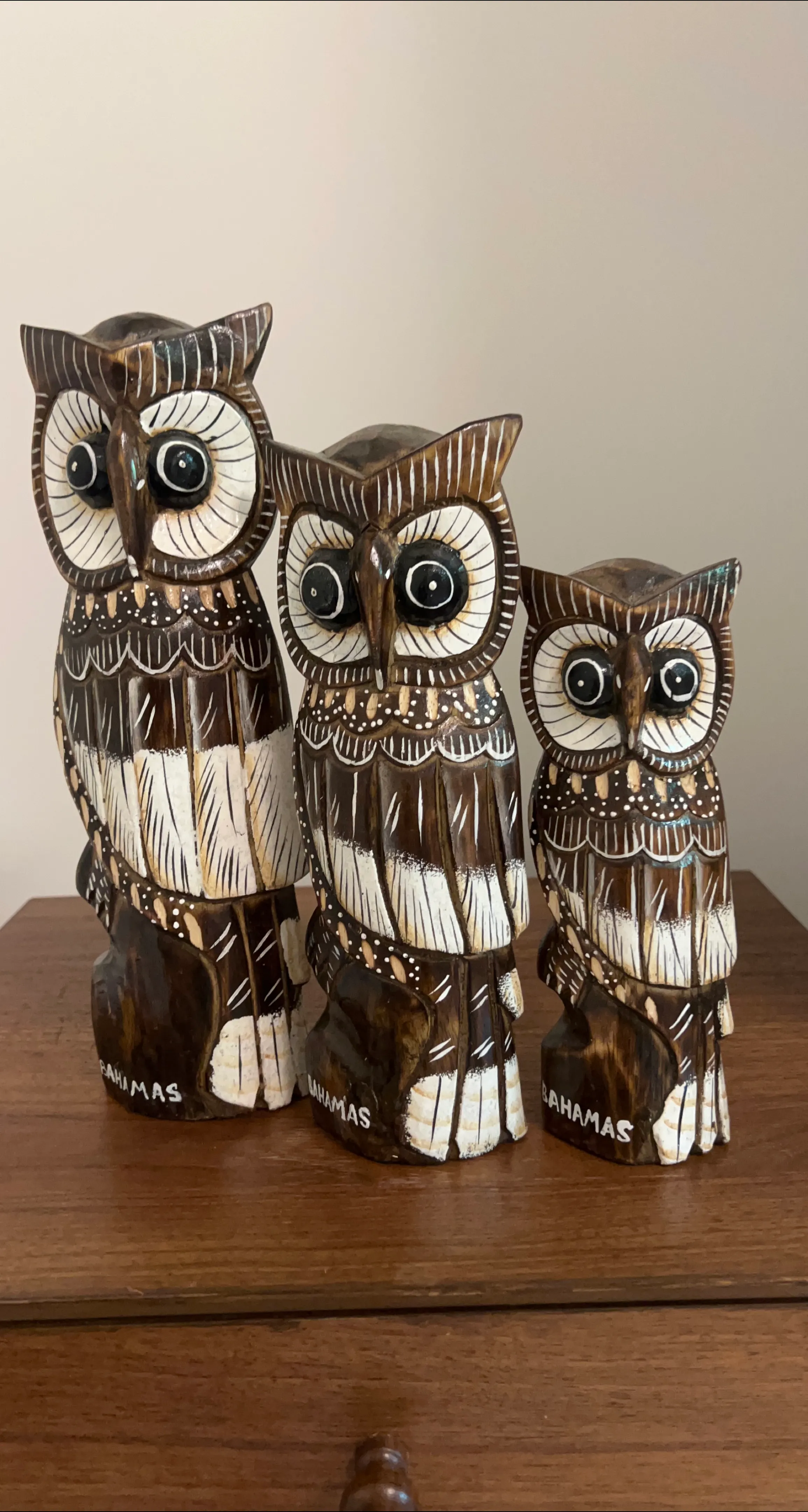 Set of three wooden owl figurines, handcrafted in the Bahamas! These charming owls are perfect for adding a touch of island flair to your home decor. They vary in size, creating a lovely tiered effect when displayed together. The details are hand-painted, making each owl unique