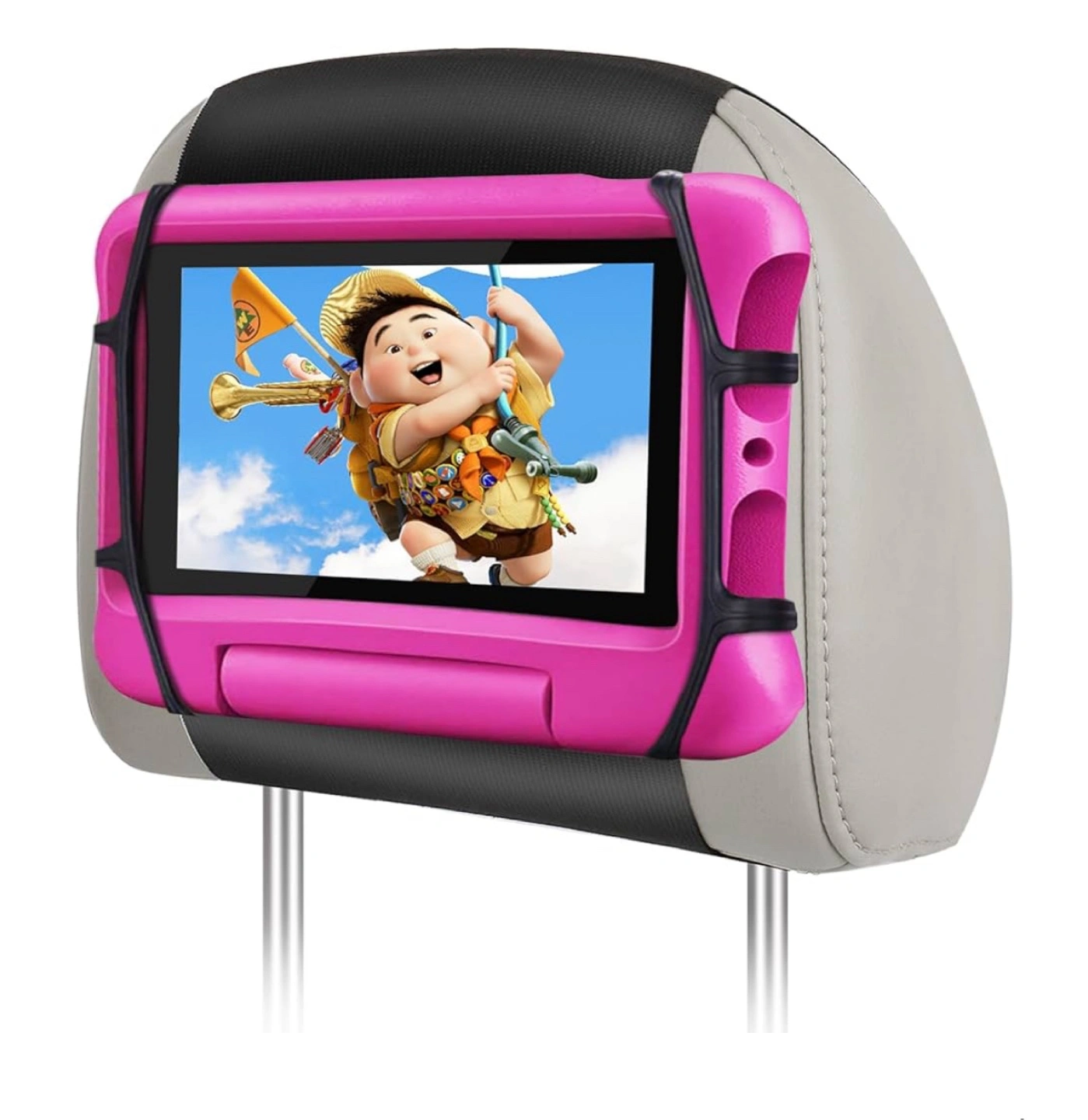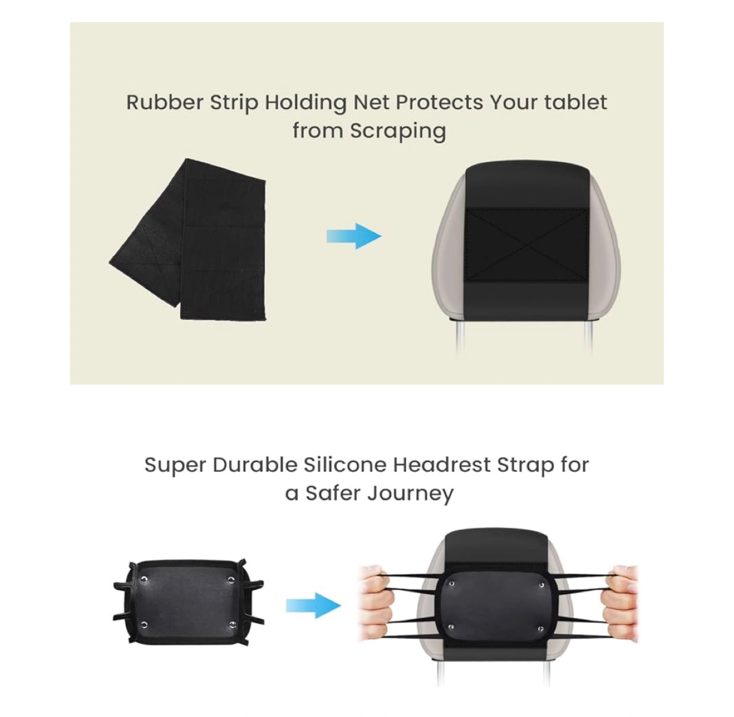 This tablet headrest mount holder is compatible with 7-12.9" tablets, including iPad Mini Air Pro, Kindle Fire HD, and Nintendo Switch. It features a rubber strip holding net to protect your tablet from scratching, and a super durable silicone headrest strap for a safer journey. Easy installation!