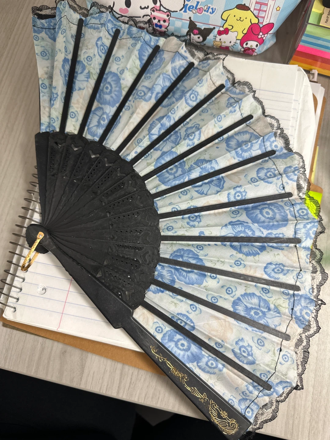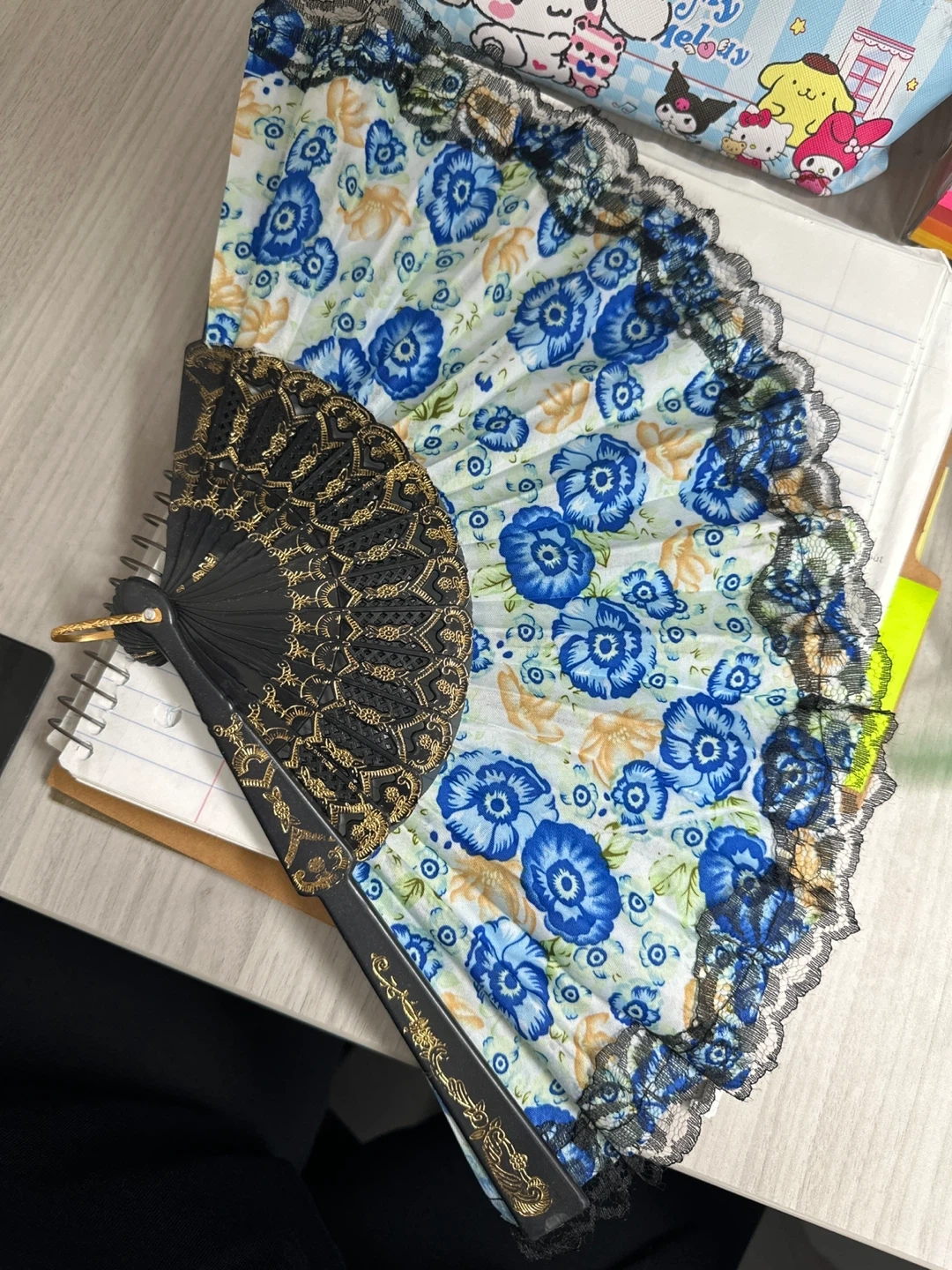 Beautiful floral hand fan featuring a delicate lace trim! The fan showcases a lovely blue floral pattern, perfect for adding a touch of elegance to any occasion. It's in great condition and ready to be enjoyed.