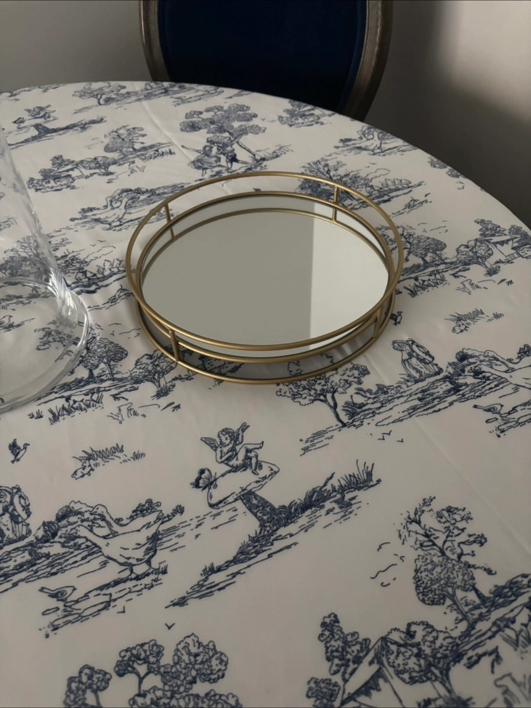 Selling a lovely round decorative mirror tray with a gold frame. It's perfect for adding a touch of elegance to any room! It would look great on a coffee table or vanity